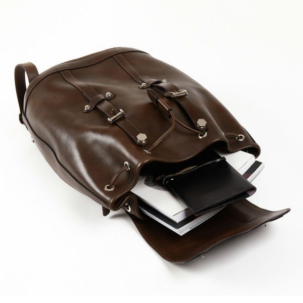 もちろん日々の使い勝手についても十分に考慮をしています。 サイドにファスナーを設けているので、いちいち被せを開閉しなくても荷物の出し入れが可能。 収納部のライニングにはピッグスウェードを使用し、収納物を優しく保護。ファスナー付きポケットも装備しているので小物の仕分け収納も可能です。 底面の革のカッティングにもご注目ください。背中面の形状が体にフィットするようカーブを描いています。 またA4クリアファイル程度のサイズなら十分に収納可能なので、ビジネスでもご利用いただけますし、小旅行程度の荷物も楽に収まります。