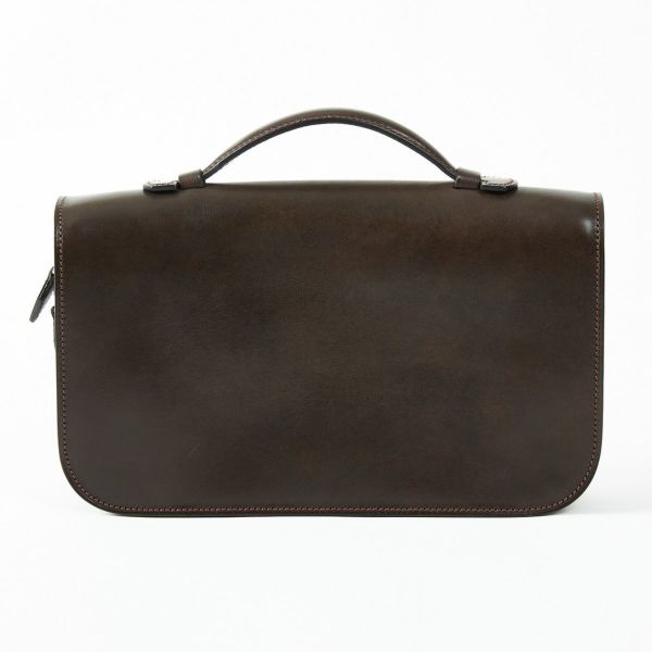 クラッチバッグと言えば、グリップに手を通して本体を掴んで持ち歩くことが多いと思いますが、長時間厚いバッグを掴んでいるのは意外と疲れます。 こちらのクラッチバッグは、グリップを通常の手さげバッグの持ち手のように使うことで、小さなブリーフのようにお役立ていただくことも可能です。 またグリップは革をミルフィーユ状に圧着した状態から削り出していくことで、強度と手馴染みが、プラスチック芯を使用したものと比べ格段に違います。