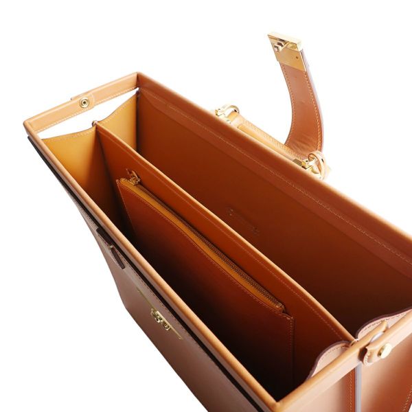 かねてからご要望をいただいていた細身のダレスバッグを実現するため、万双の職人が発案したのが、トップに口枠を採用することでした。 幾度となく試験を繰り返した結果、全開時に枠が14.5cmほど開き、物の出し入れがしやすい納得のいく設計に辿りつきました。 職人として課題に真正面から取り組み、万双の名に恥じないブライドルの細マチダレスバッグが誕生しました。