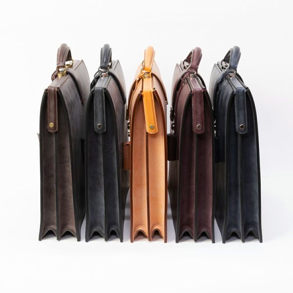 世に出回っているブライドルレザーの中には、ツルっとした質感を出すために顔料仕上げを施したものもありますが、その場合、使っているうちに顔料が割れてきてしまうという問題をはらんでいます。 そこで万双では顔料を使用せず手間のかかる染料仕上げを採用、これにより使い込んでも表面の割れが発生しません。 さらにじっくり緩やかにエイジングをしていくので、ビジネスシーンでも違和感なく長く愛用いただけます。 ブライドルレザー自体がとても堅牢なので、安定感抜群で自立するところも好評をいただいております。