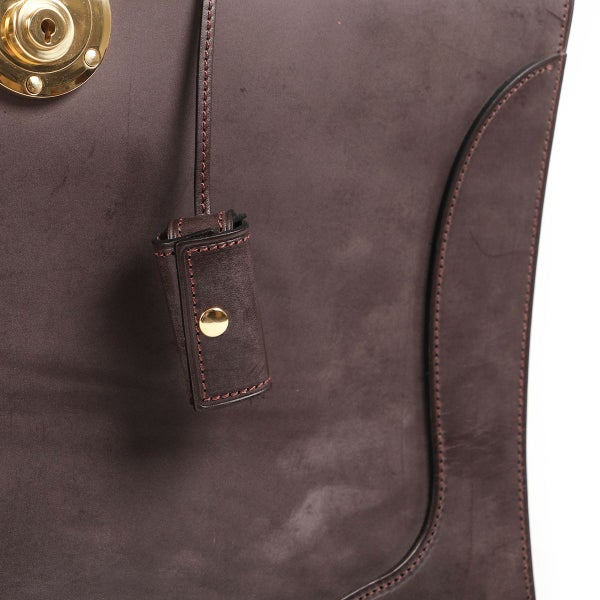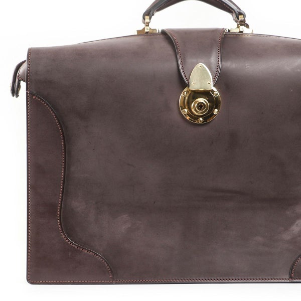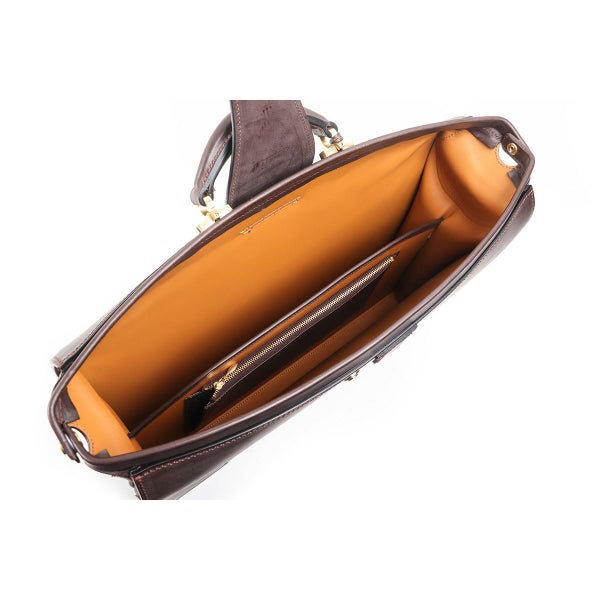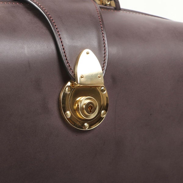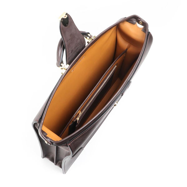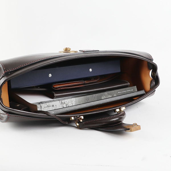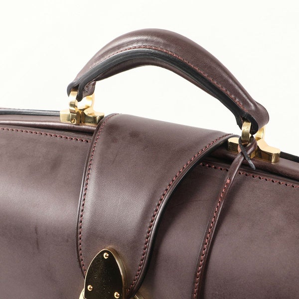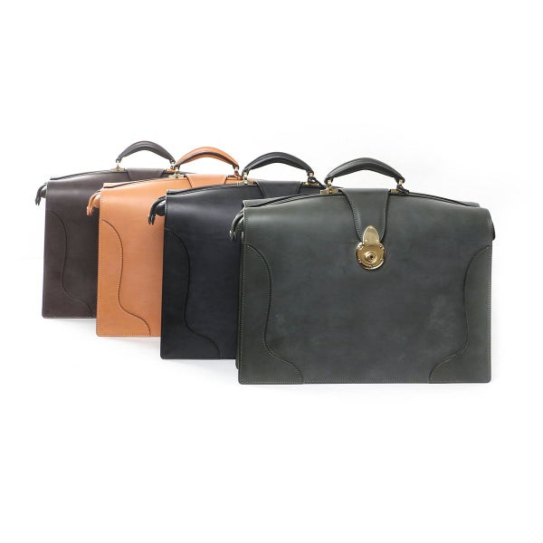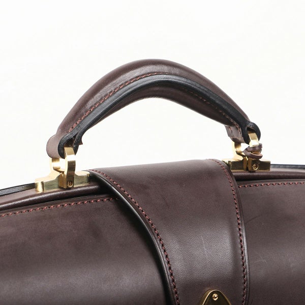 マチを折り畳んで口枠を閉じることでバッグ全体にふくよかなフォルムが表れ、マチがアール状になっているのに口枠を全開にした状態で止まる、「本来のダレス」を作りたいという想いから製作。 二つマチダレスバッグは国内外でもほとんど作られていませんが、三つマチだと体格やキャラクターとのバランスが難しいお客様にご提案できるよう製作しています。 本場英国でもほとんど見ることのできない、スタイリッシュなダレスバッグが出来たと自負しています。