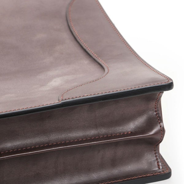 世に出回っているブライドルレザーの中には、ツルっとした質感を出すために顔料仕上げを施したものもありますが、その場合、使っているうちに顔料が割れてきてしまうという問題をはらんでいます。 そこで万双では顔料を使用せず手間のかかる染料仕上げを採用、これにより使い込んでも表面の割れが発生しません。 さらにじっくり緩やかにエイジングをしていくので、ビジネスシーンでも違和感なく長く愛用いただけます。 ブライドルレザー自体がとても堅牢なので、安定感抜群で自立するところも好評をいただいております。
