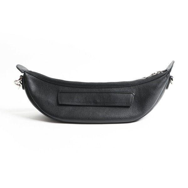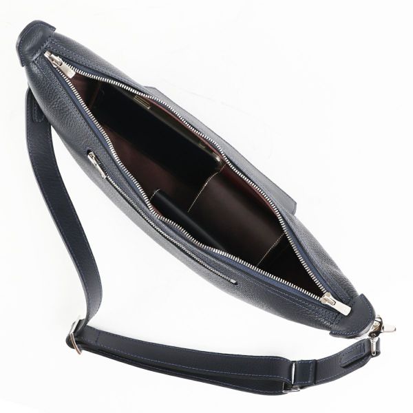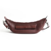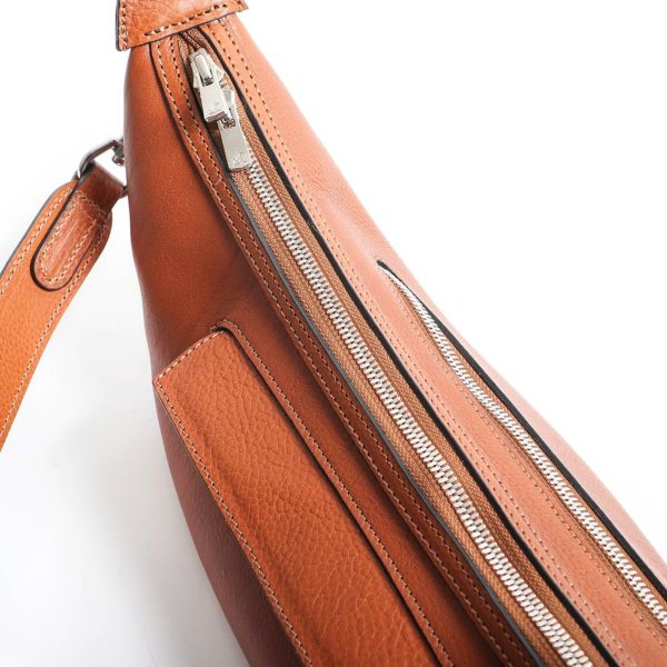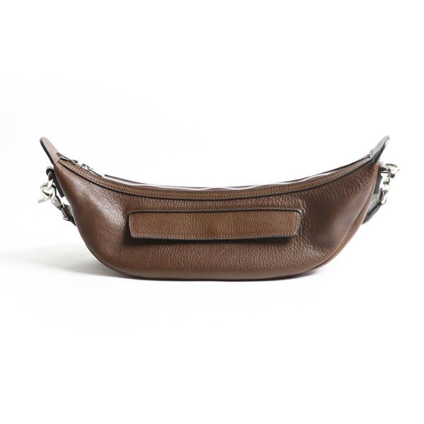 男性の身体に美しくフィットする、キレイな三日月型のフォルムを作り上げるに大変な時間を費やし、何度も型紙を起こし試作を作ることで、このフォルムに辿り着きました。 人間工学に基づき作製しているので違和感なく体にフィットし、負荷がかからない仕様になっています。 また最も負荷がかかるショルダーストラップは、ナイロンなどの異素材を使わず、革を2枚貼り合わせて縫製しコバ磨きまで手がけています。手間もコストもかかりますが、安心してご利用いただくための万双としてのこだわりです。 ストラップの金具なども高級感があり、小さいながら他のバッグ同様、所有感を味わうことが出来るボディバッグです。