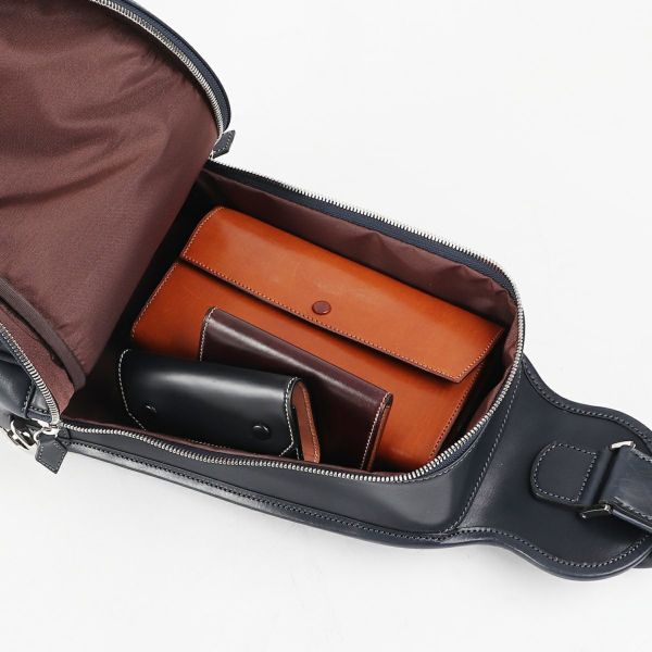 ワンショルダーバッグとして使える最大級のサイズ感で製作。そのぶん収納力がグンとアップする一方で、決して不恰好にならない均整の取れたデザインで仕上げました。 またサイズの変更に合わせて、フォルムも従来のものより丸みを帯びた形に変更。 ビジネス使用にも十分に耐えられる、上品な雰囲気になっています。