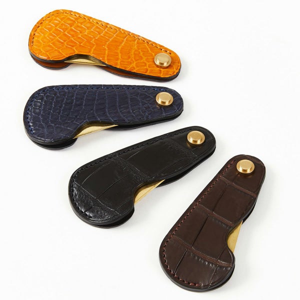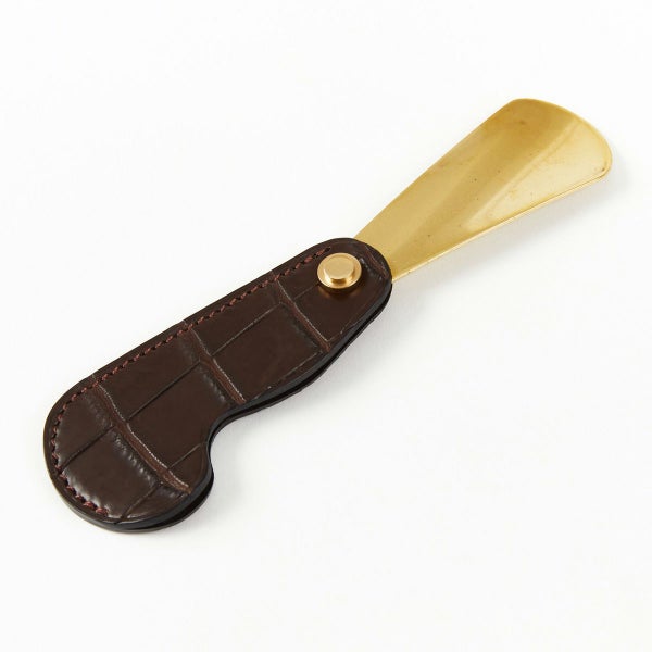 どうしても靴を脱ぎ履きしなければいけない状況になった際、ポケットやバッグの中からスッと自前のシューホーンを出せたら立派なジェントルマン。 そうした利用シーンを想定して製作したのが、こちらの携帯用シューホーンです。 畳んだ状態なら手のひらにすっぽり収まるサイズで、ポケットに入れてもまったく違和感がなく、携帯性は抜群。 また持ち手となるカバー部分の持ちやすさや、ベラ部分の真鍮の長さを必要最小限に設定するなど、携帯性と実用性をギリギリまで追求いたしました。