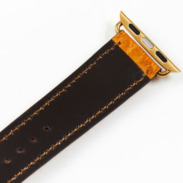主役であるアップルウオッチののスポーティなイメージやガジェット感を引き立てるために、革バンドは主張しすぎないフラットなデザインに仕立てました。 その一方で革の上質感を活かすために芯材にも革を使用し、三層構造で仕上げています。 こちらは「玉符」により、カジュアルな印象が強いアップルウォッチバンドに仕上がっています。