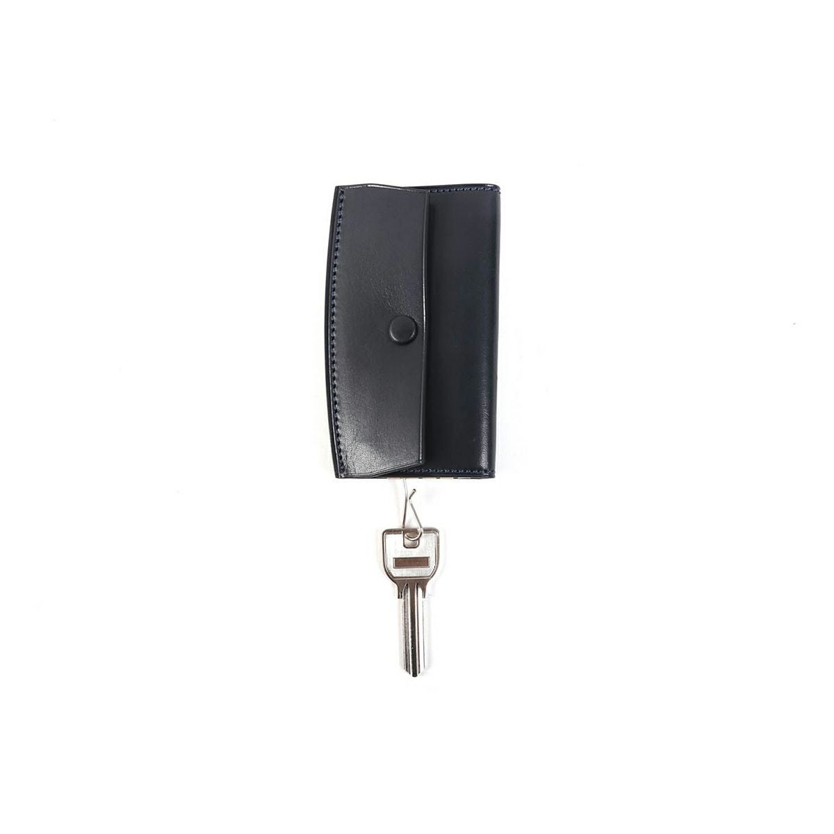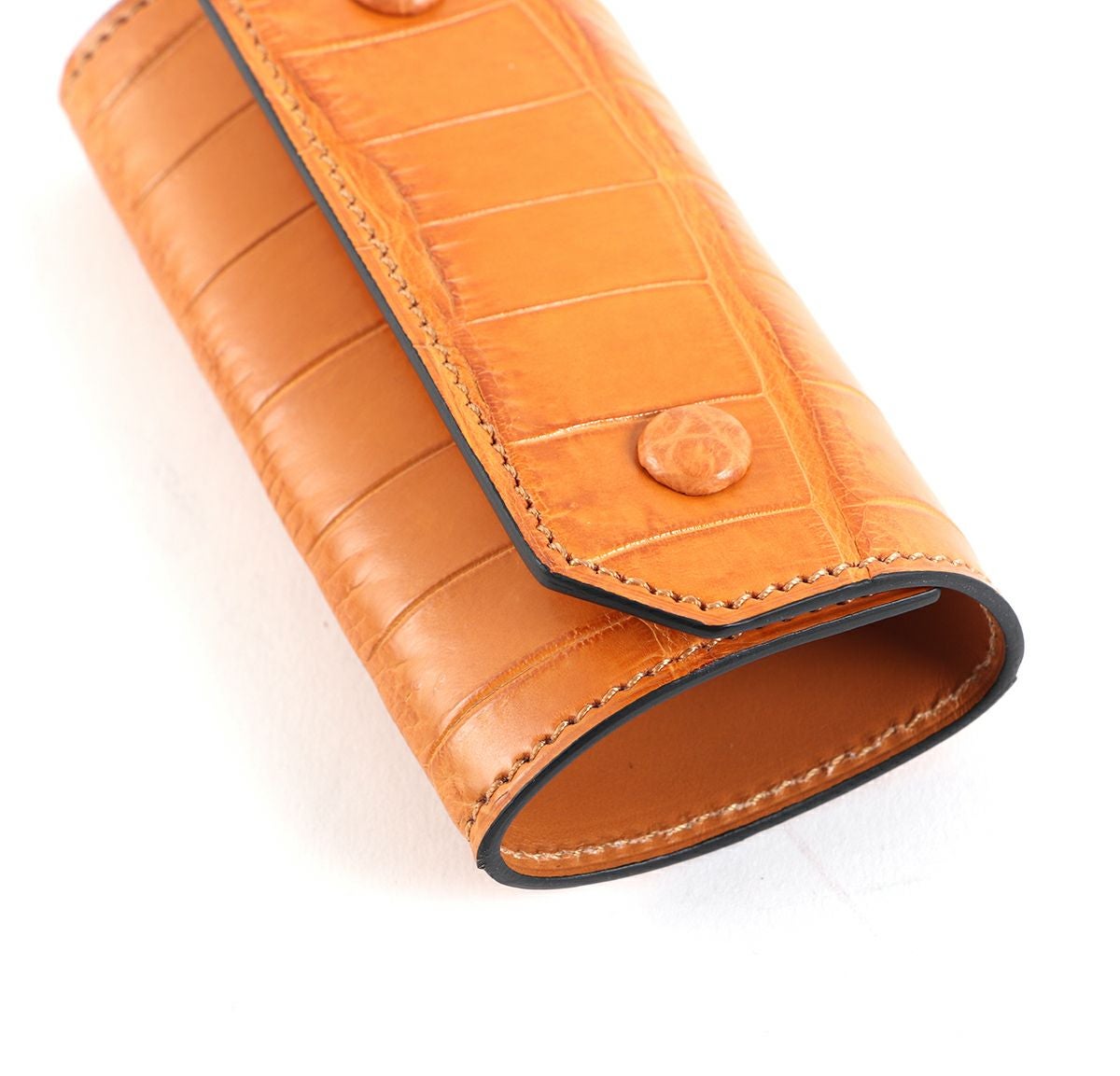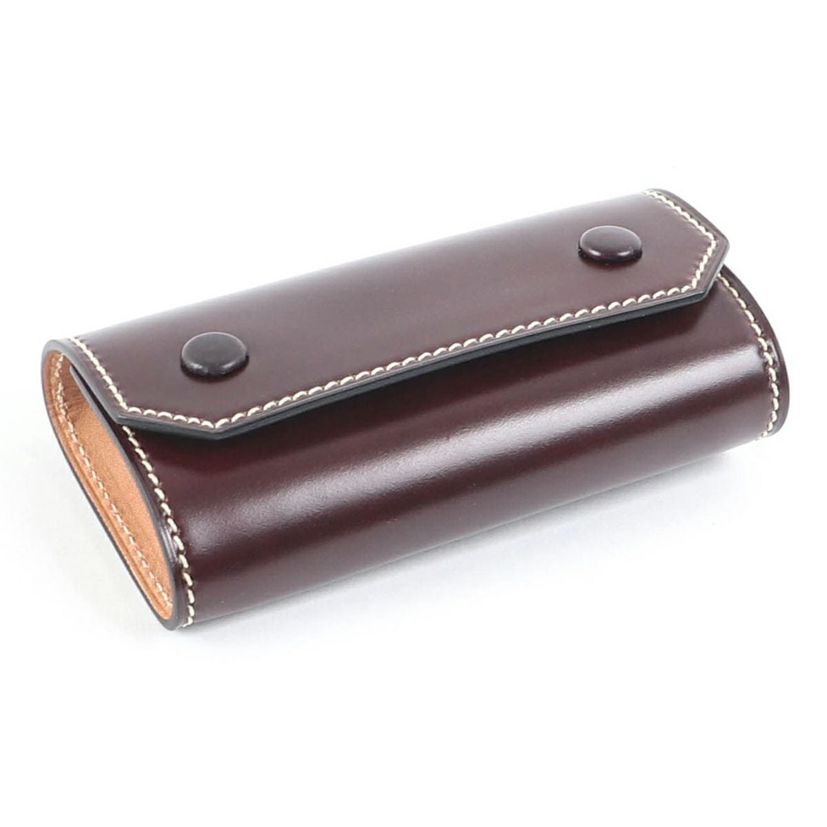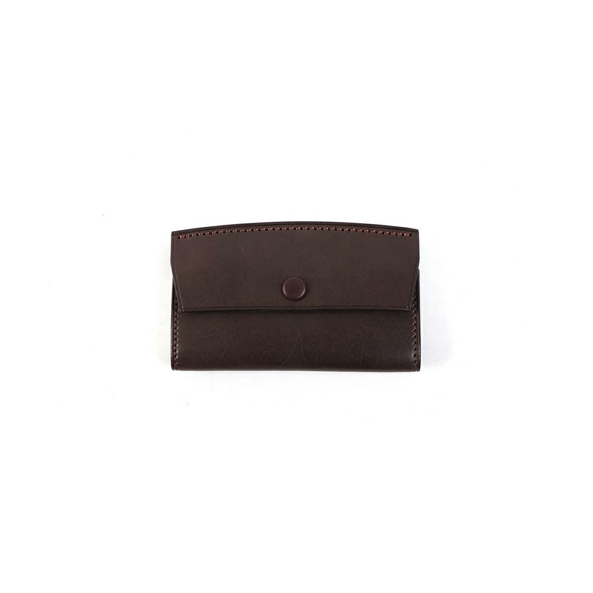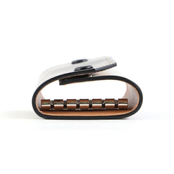 表裏のサイズの歪みを調整しながら組み上げ、革に豊かな表情を。これは、ブリーフケースの被せを製作する時に用いる技法を、キーケースに応用。ホックも革ぐるみボタンで大変贅沢な作りになっております。