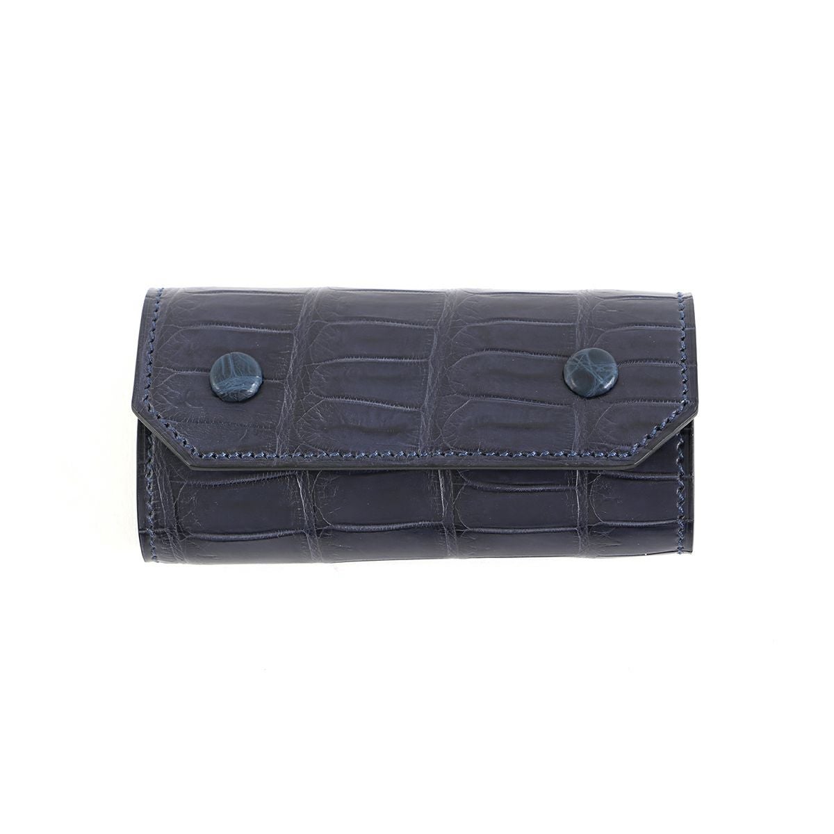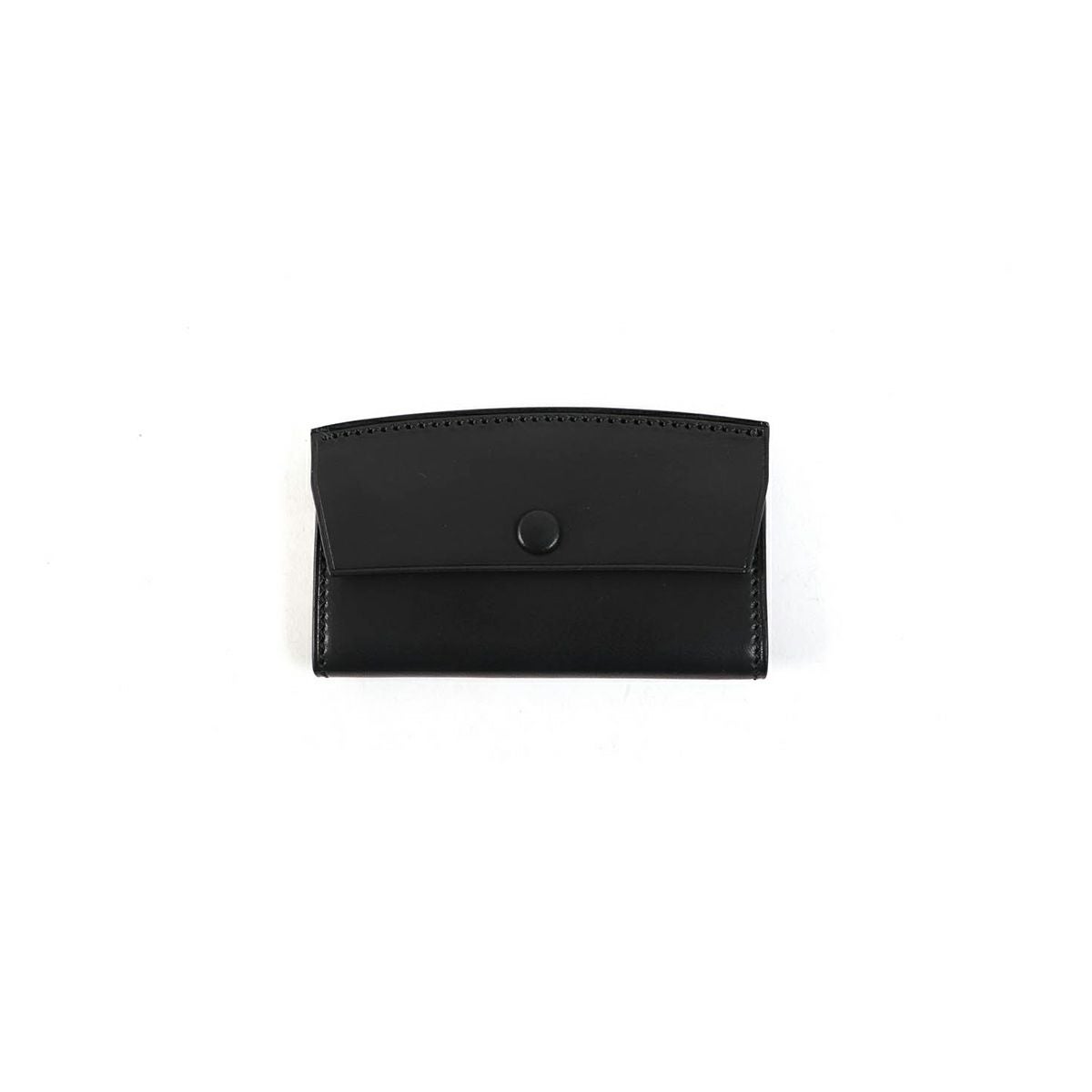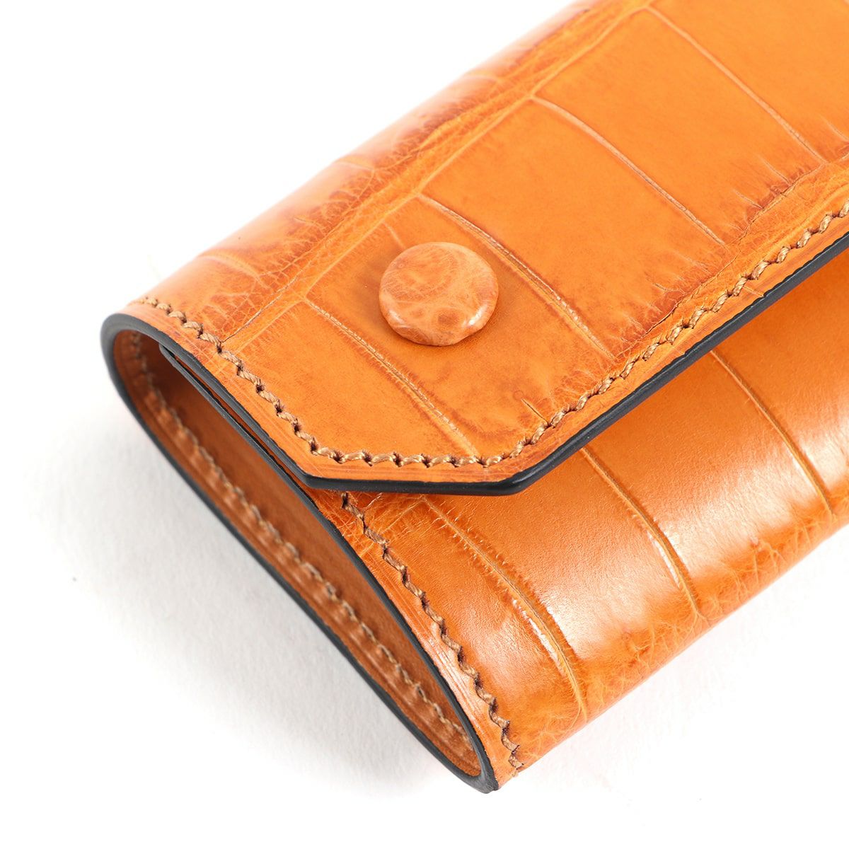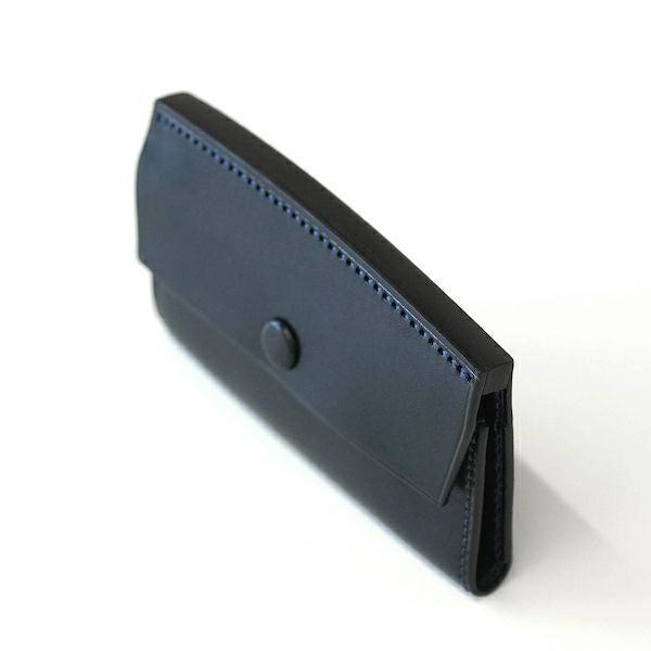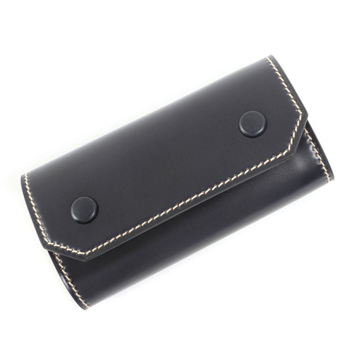 表裏のサイズの歪みを調整しながら組み上げ、革に豊かな表情を。これは、ブリーフケースの被せを製作する時に用いる技法を、キーケースに応用。ホックも革ぐるみボタンで大変贅沢な作りになっております。