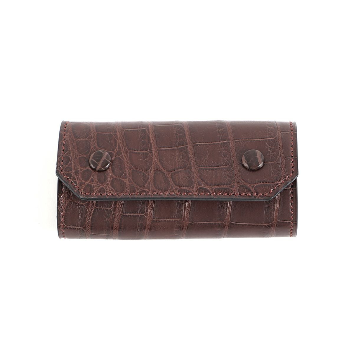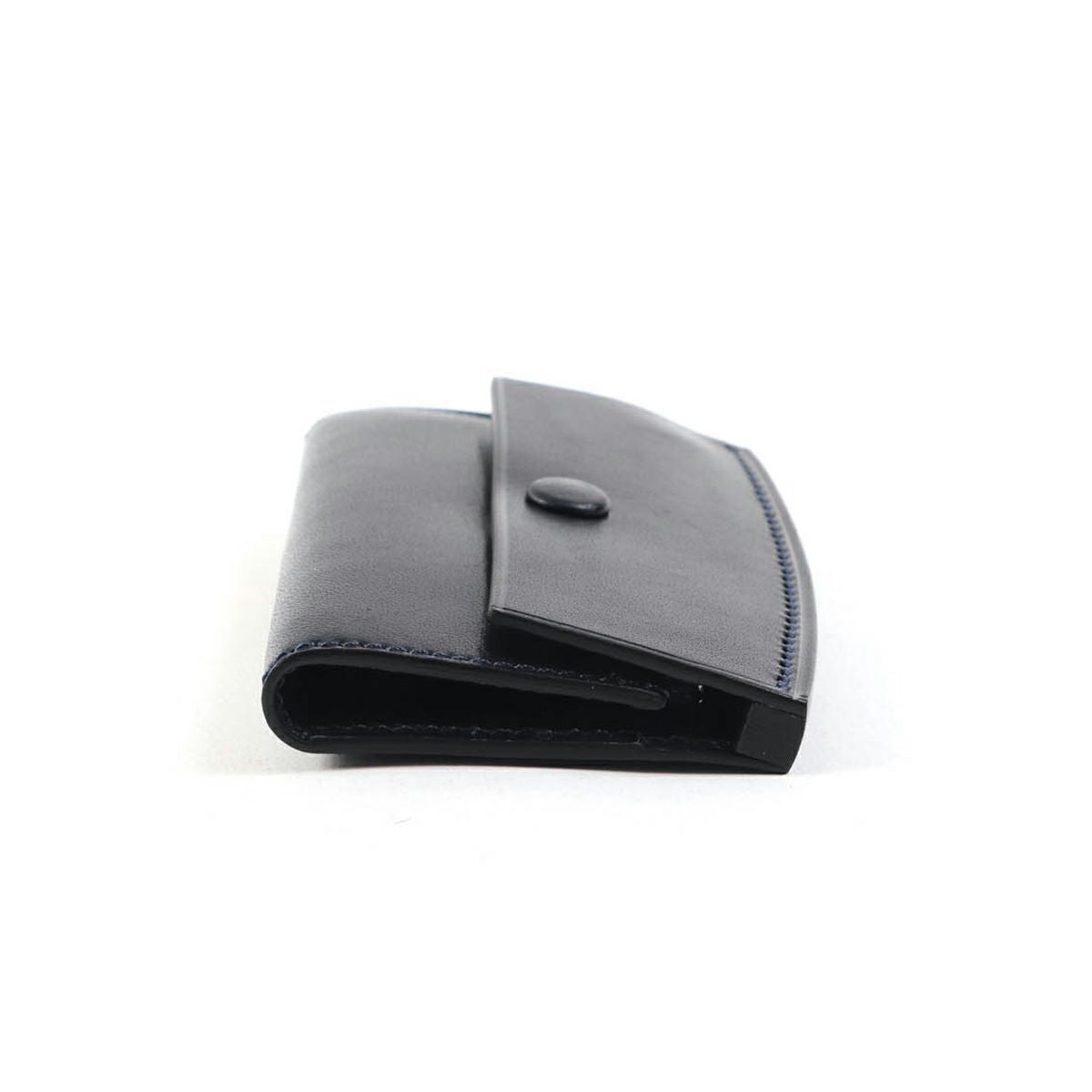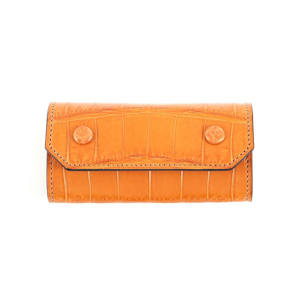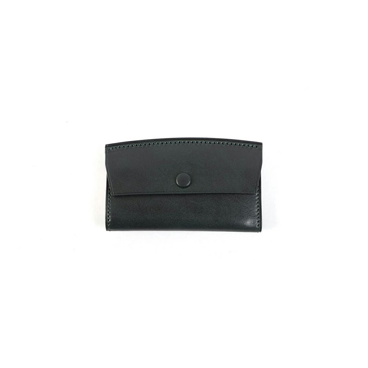 表裏のサイズの歪みを調整しながら組み上げ、革に豊かな表情を。これは、ブリーフケースの被せを製作する時に用いる技法を、キーケースに応用。ホックも革ぐるみボタンで大変贅沢な作りになっております。