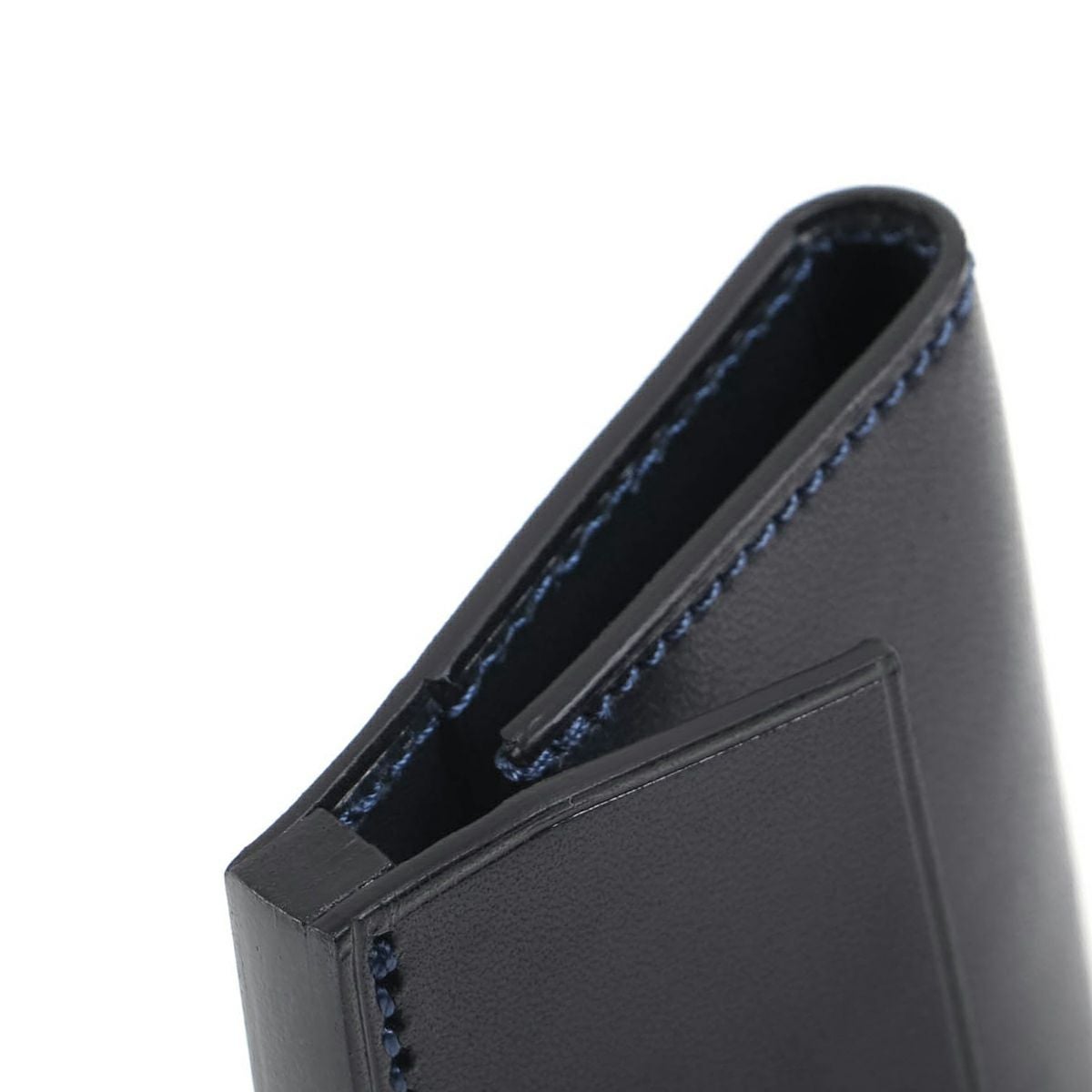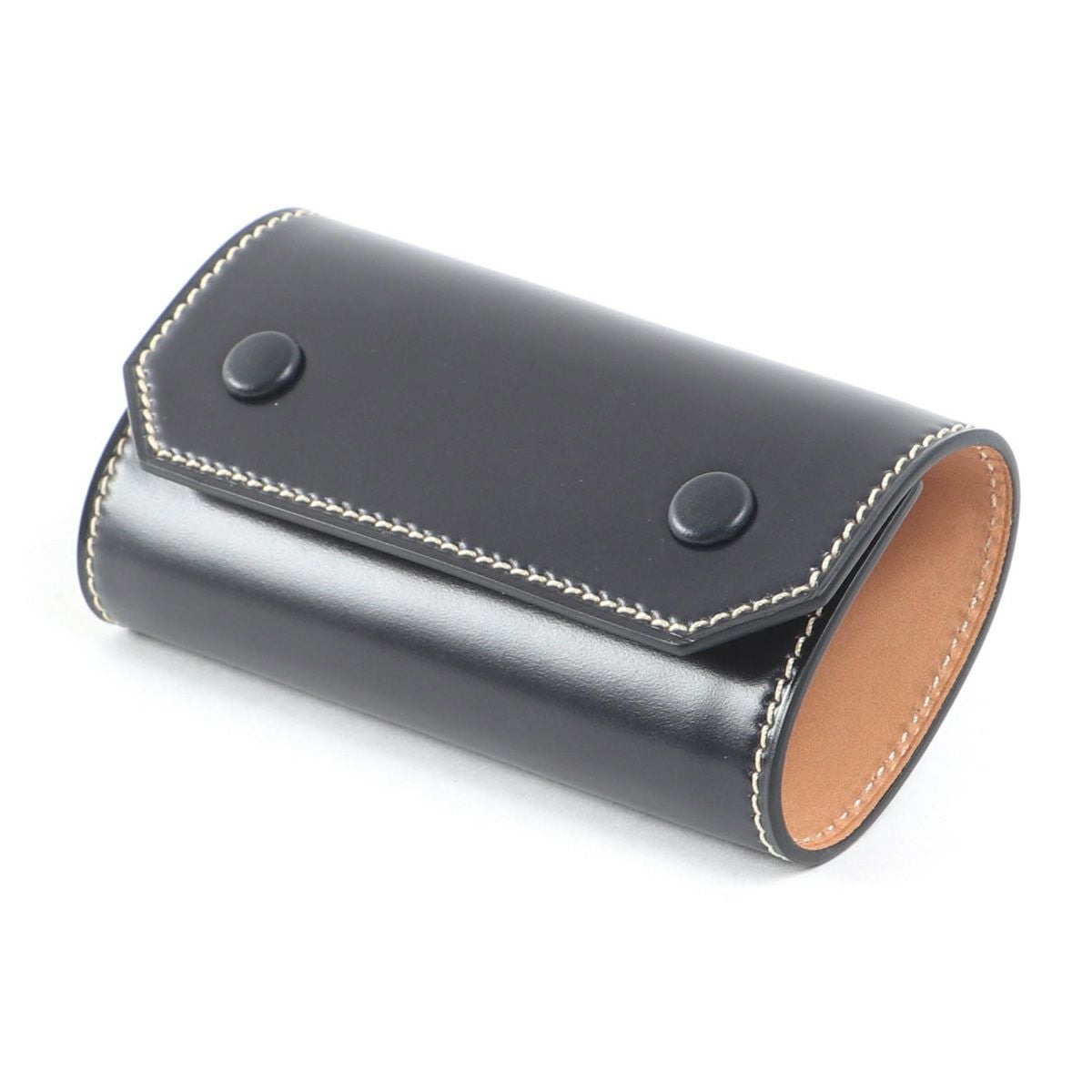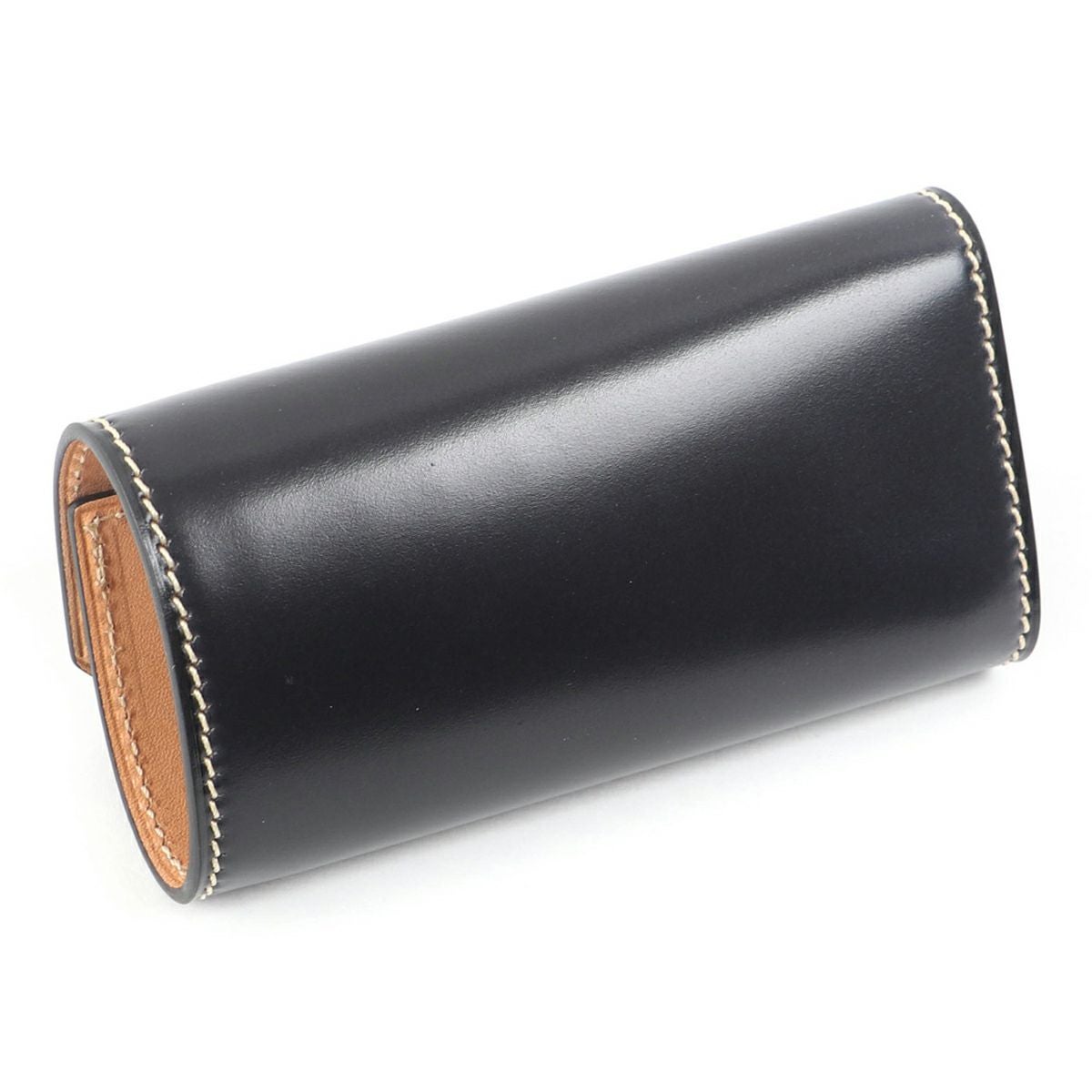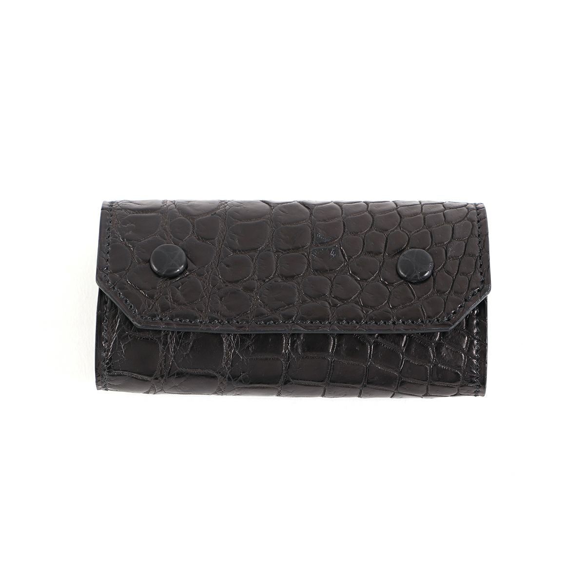 表裏のサイズの歪みを調整しながら組み上げ、革に豊かな表情を。これは、ブリーフケースの被せを製作する時に用いる技法を、キーケースに応用。ホックも革ぐるみボタンで大変贅沢な作りになっております。
