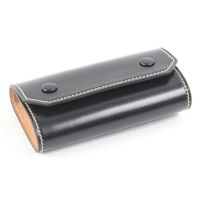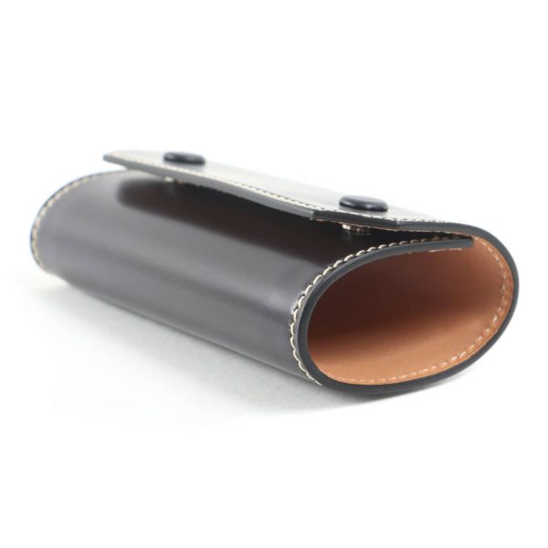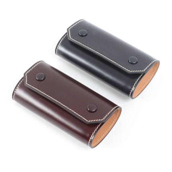 外側の革と内側の革との間にゆとりをもたせることでキレイなラウンドを描く、ブリーフケースの被せを製作技法を応用して作ったキーケースです。 ホックも革ぐるみボタンで、小さいながらも大変手間がかかった贅沢な作りになっております。