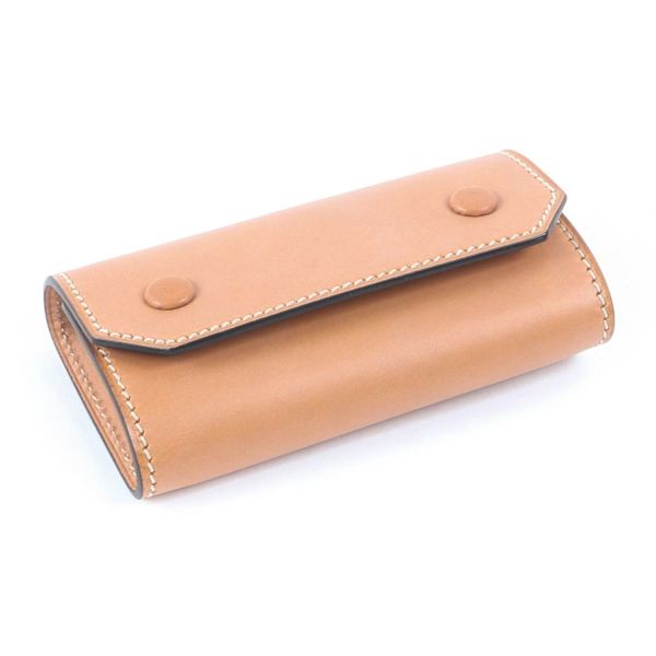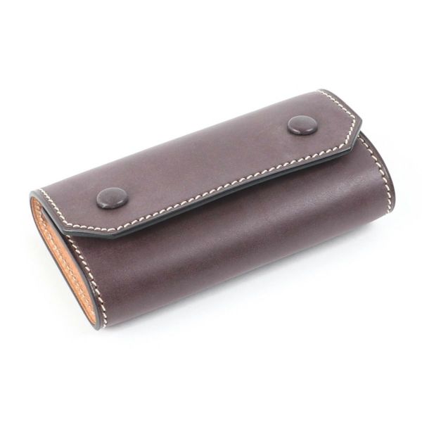 表側の革と内側の革との間にゆとりをもたせることでキレイなラウンドを描く、ブリーフケースの被せを製作技法を応用して作ったキーケースです。 ホックも革ぐるみボタンで、小さいながらも大変手間がかかった贅沢な作りになっております。