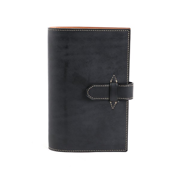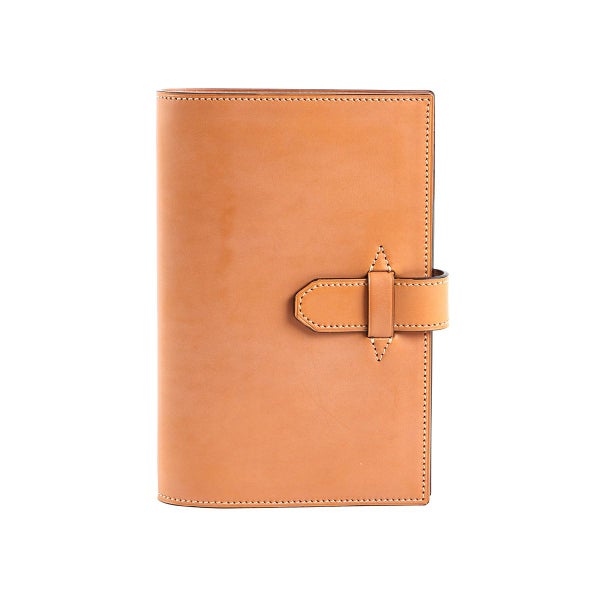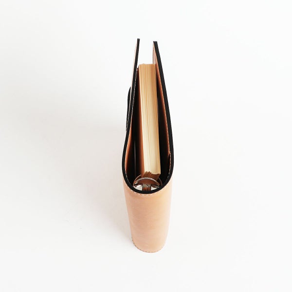 一般的な手帳ケースは内側の革をベタ貼りにしているため、表側の革のしなり具合に影響を及ぼし、背部分の形状がどうしても角張りがちです。 そこで万双では、ブリーフケースの被せ部分の製作方法と同様に、内側のヌメ革をベタ貼りにせず表側の革との間にゆとりをもせたせることで、背部分のラウンドをキレイに描くことに成功しています。