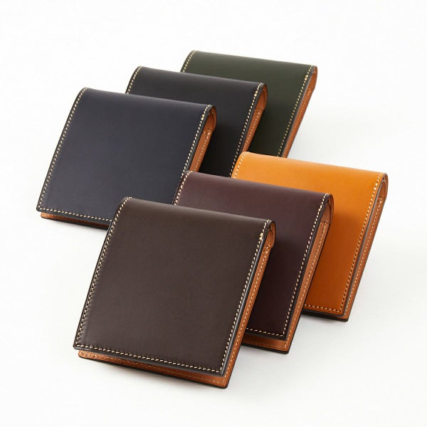 二つ折り財布はビジネス・プライベートの様々なシーンで使用されるので、カラー展開は「ブラック」「ダークブラウン」「キャメル」「ネイビー」「グリーン」「ボルドー」の計6色をご用意。 お使いになる環境などを考慮して、最適な色をお選びください。