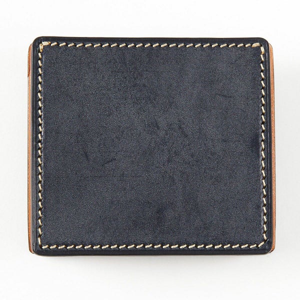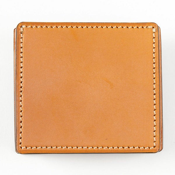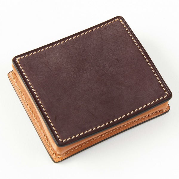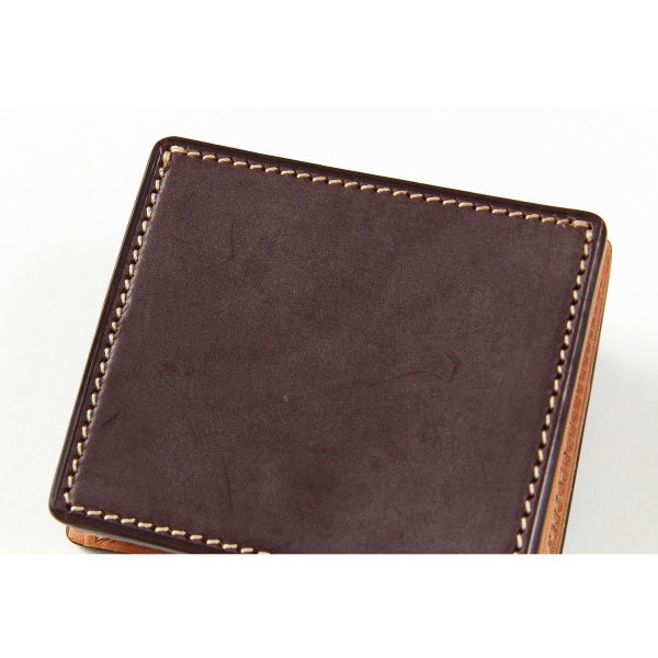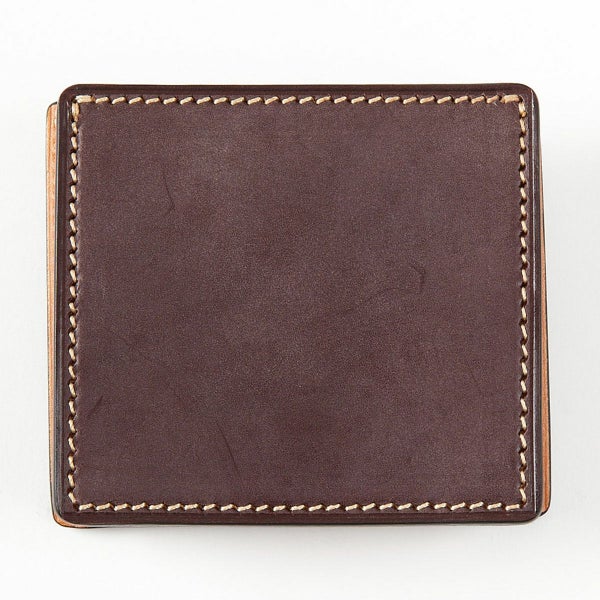 手間ひまをかけて丁寧にコバ処理がされている製品は、コバが傷ついてしまっても何度でも磨き直しが可能なため、何十年と使用された製品も、コバ磨きをすることで再び輝きを取り戻し、長くお使いいただくことができます。 こちらの小銭入れのように分厚いブライドルレザーを重ね、ズレないよう貼り合わせてコバを磨き上げるのは、非常に手間のかかる作業を必要とします。
