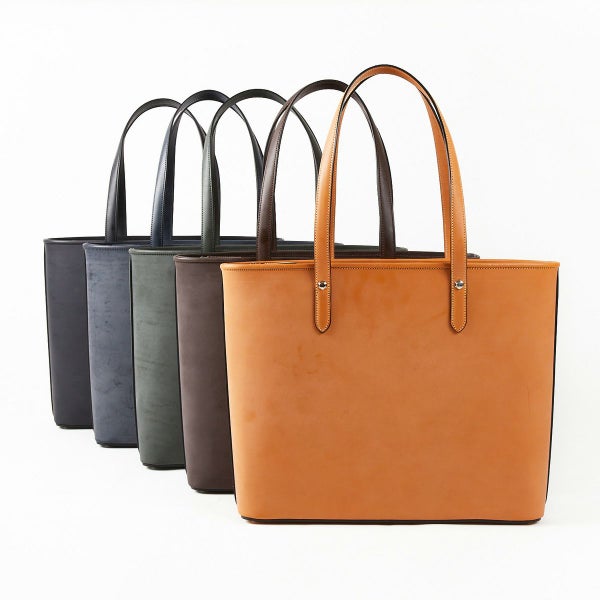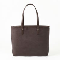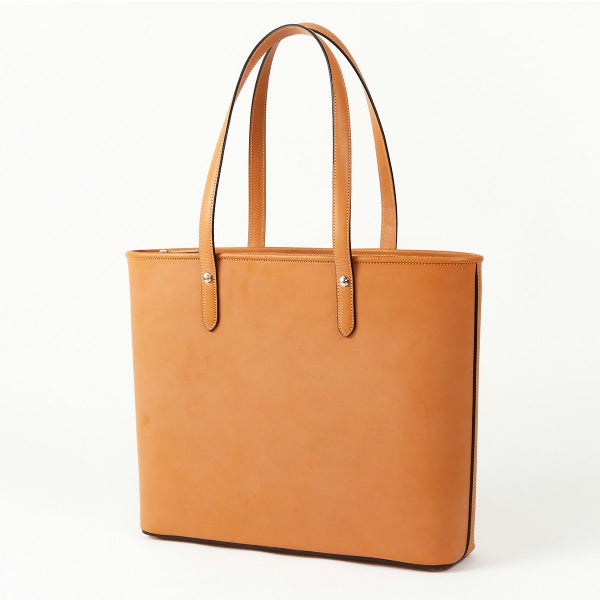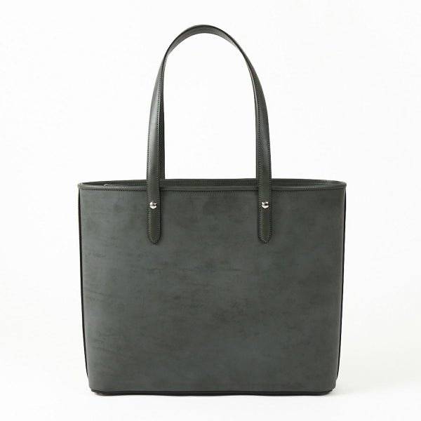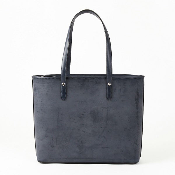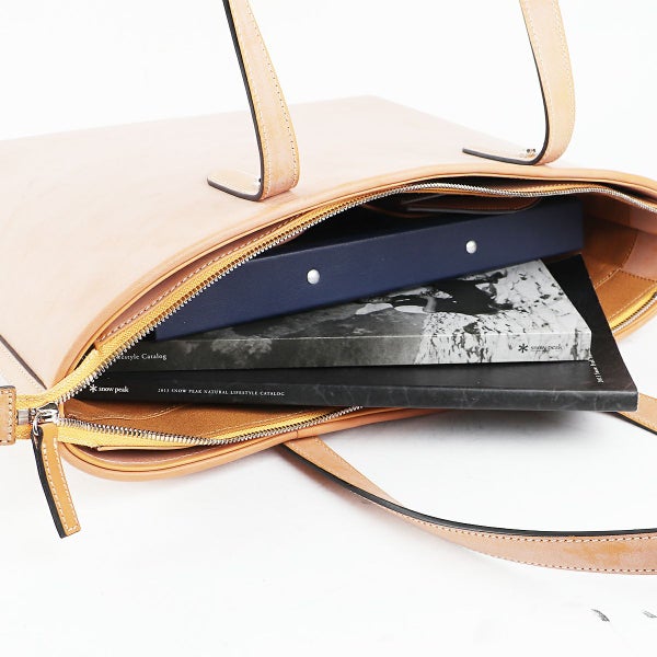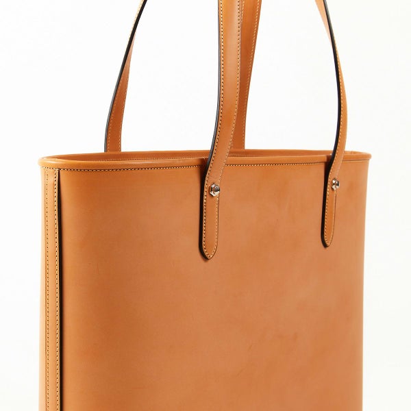 「シンプルなデザインで使い勝手も良いけど、革の質感を楽しみたい」。 そういったご要望に十分にお応えできるのが、こちらのトートバッグ。 底には5点ほど鋲をつけており、硬い路面に直置きしても革を傷つける心配がないので、ガシガシお使いください。