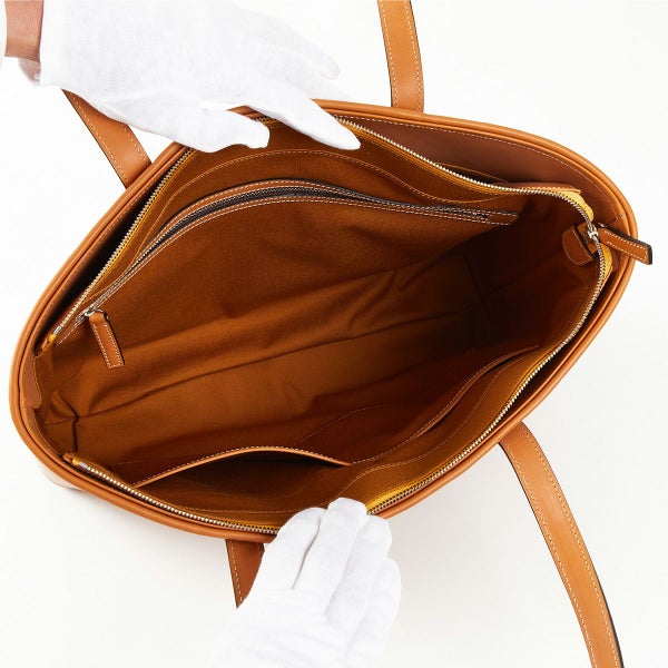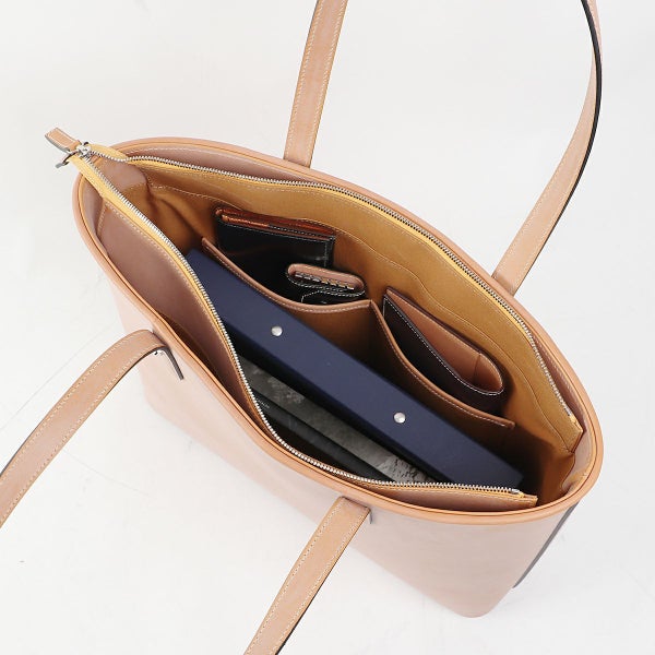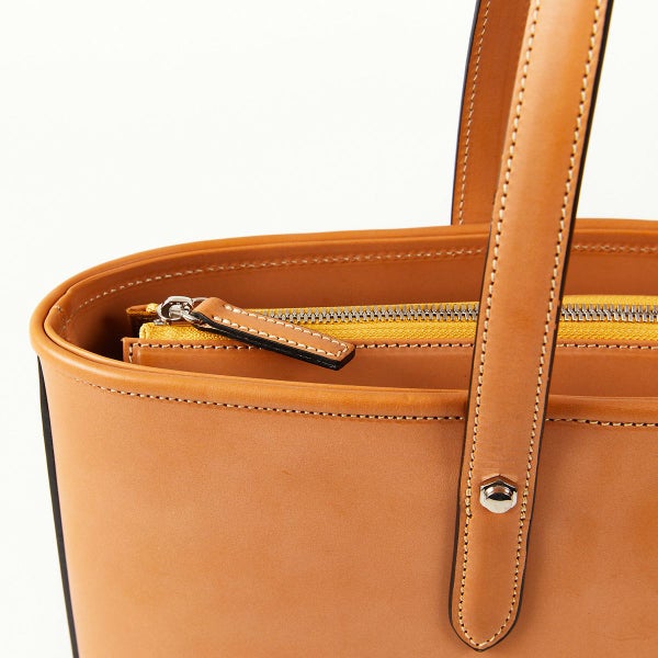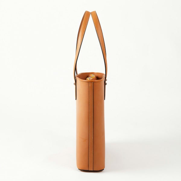 ブライドルレザーというハードな質感の革をふんだんに使いながら、柔らかい曲線を描くことでフェミニンな雰囲気を出すことに成功。女性のお客様からも非常に好評をいただいているトートバッグです。 持ち手は細身ですが、万双のオーダーベルトと同じ製法を採用しており、非常にコシのある作りになっています。やや長めにしていることもあり、手や肩へのストレスも最小限に抑えています。