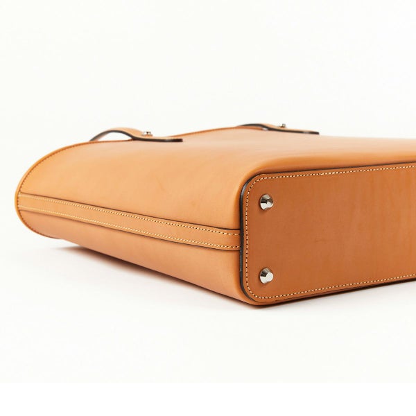 世に出回っているブライドルレザーの中には、ツルっとした質感を出すために顔料仕上げを施したものもありますが、その場合、使っているうちに顔料が割れてきてしまうという問題をはらんでいます。 そこで万双では顔料を使用せず手間のかかる染料仕上げを採用、これにより使い込んでも表面の割れが発生しません。 さらにじっくり緩やかにエイジングをしていくので、ビジネスシーンでも違和感なく長く愛用いただけます。 ブライドルレザー自体がとても堅牢なので、安定感抜群で自立するところも好評をいただいております。