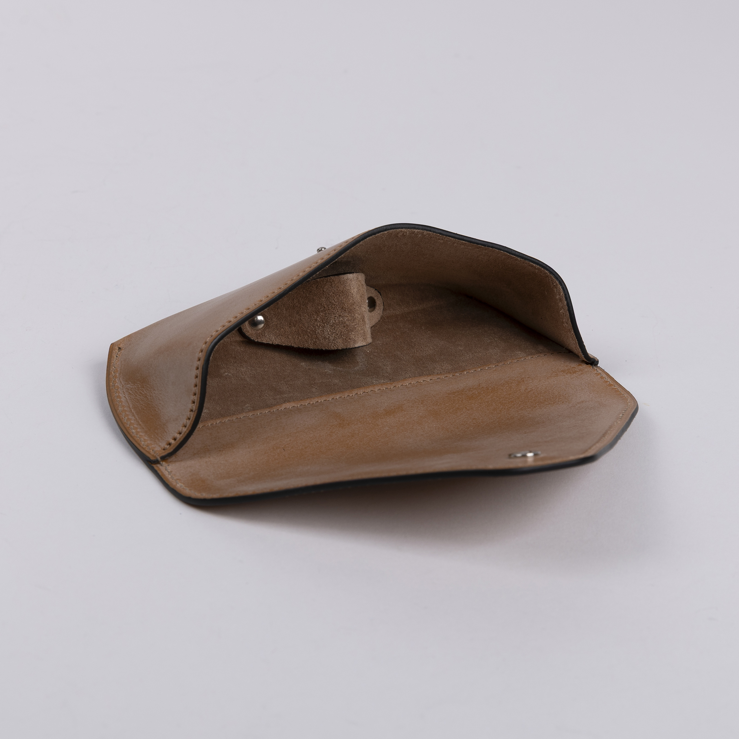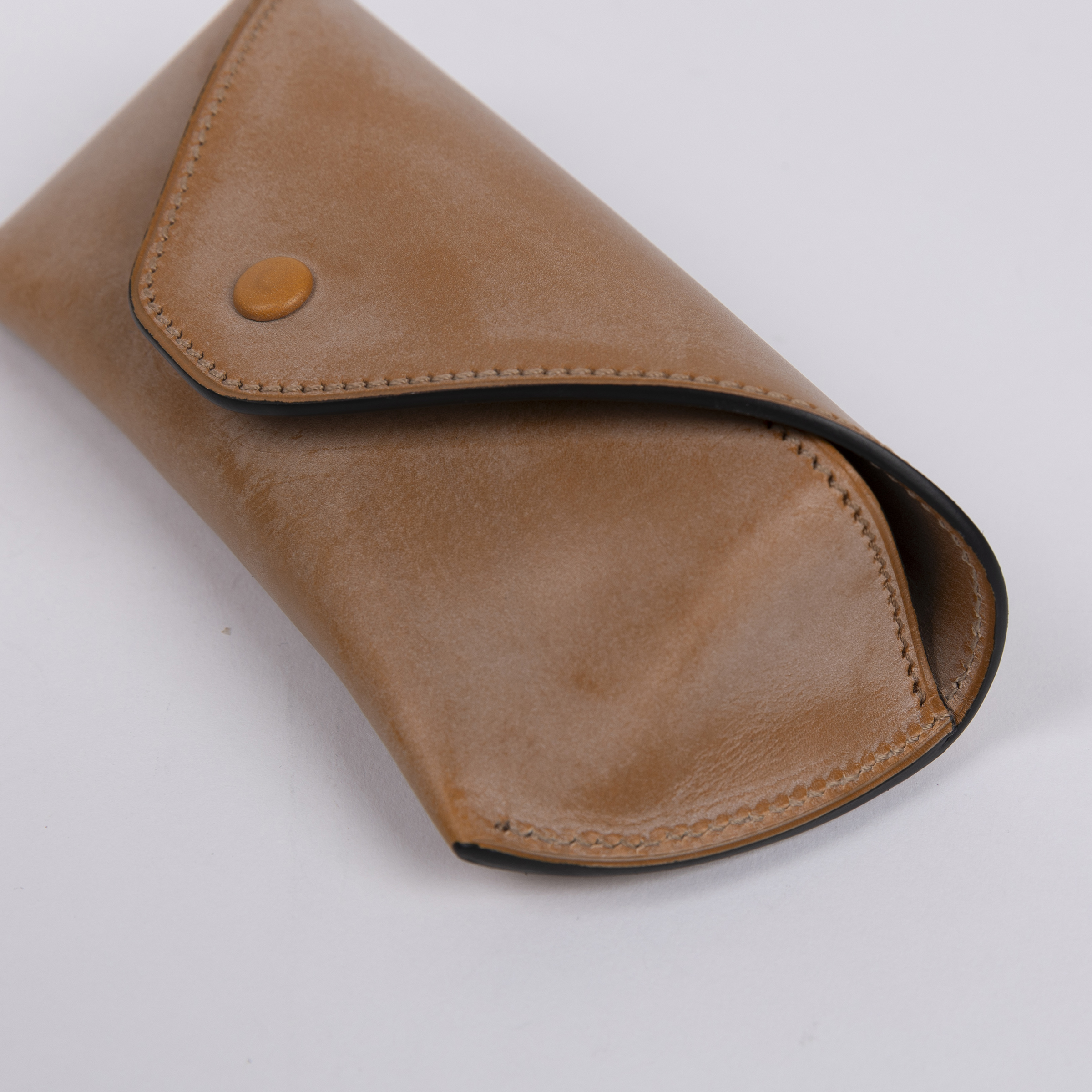 これまで社内において、メガネケースの企画化については何度も声が上がっていました。しかし、そのたびに「万双らしいメガネケースが作れるのか」と自問自答が始まり、断念してきました。 試行錯誤を繰り返し辿り着いたのが、「全面にブライドルレザーを使用したものなら、“これぞ万双”とお客様から言っていただけるようなメガネケースに仕上がるのではないか」という結論。そして企画化に踏み切り、やっと実現したのがこちらの商品になります。 実際にご覧になっていただくとわかりますが、胴面は一枚革によるダイナミックな仕上がりになっています。板のように硬いブライドルレザーを使いながら、きれいなカーブや、立体的な加工を施すことができたのは、職人の高度な技術の賜物です。 内部にはノースブリッジを装備、また内張りにピッグスエードを使用することで、お客様の大切なメガネをきちんとお守りできるよう仕上げています。