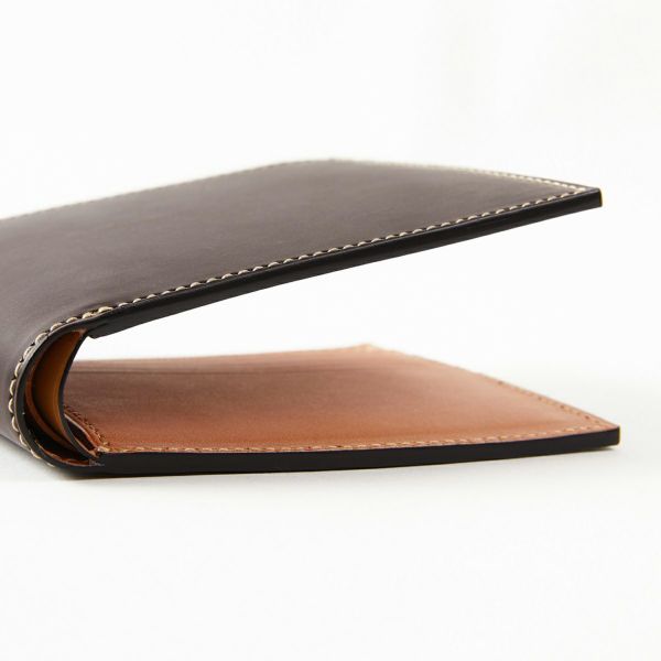 内装部分にはヌメ革を使用していますが、この材料だけで通常の財布が3つ作れてしまいますのが万双の二つ折財布。全体的なスリムなラインを保つために、内装材の厚みの調整の微妙な感覚と技術が必要となります。 革をふんだんに使いながら、ほどよく抑えられた厚みをぜひご覧ください。