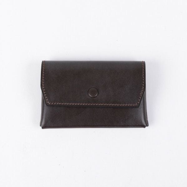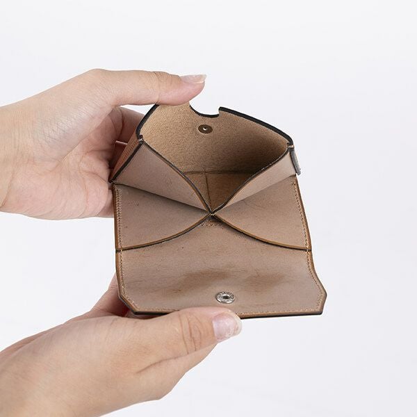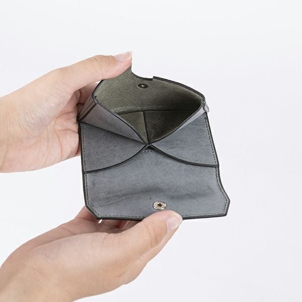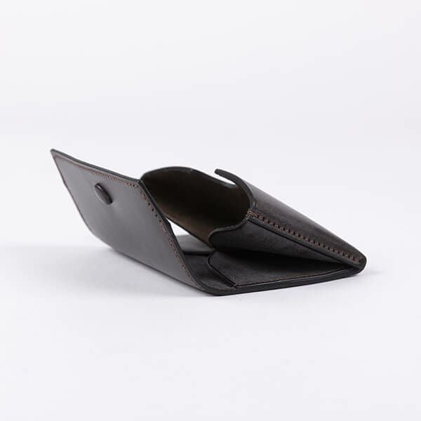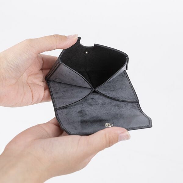 商品化にあたり仕様を一部変更。名刺収納部を2室構造にし、またバッグ同様にメインポケットの内張りにピッグスエードを使用するなど、より高級感を増しています。連結部分を折りたたみ被せで留めれば厚みを抑えられる仕様や、片側の収納室を箱型にすることで名刺が整然と収納できるところなど、クラシックなバッグから着想を得た仕様については、そのまま生かしています。