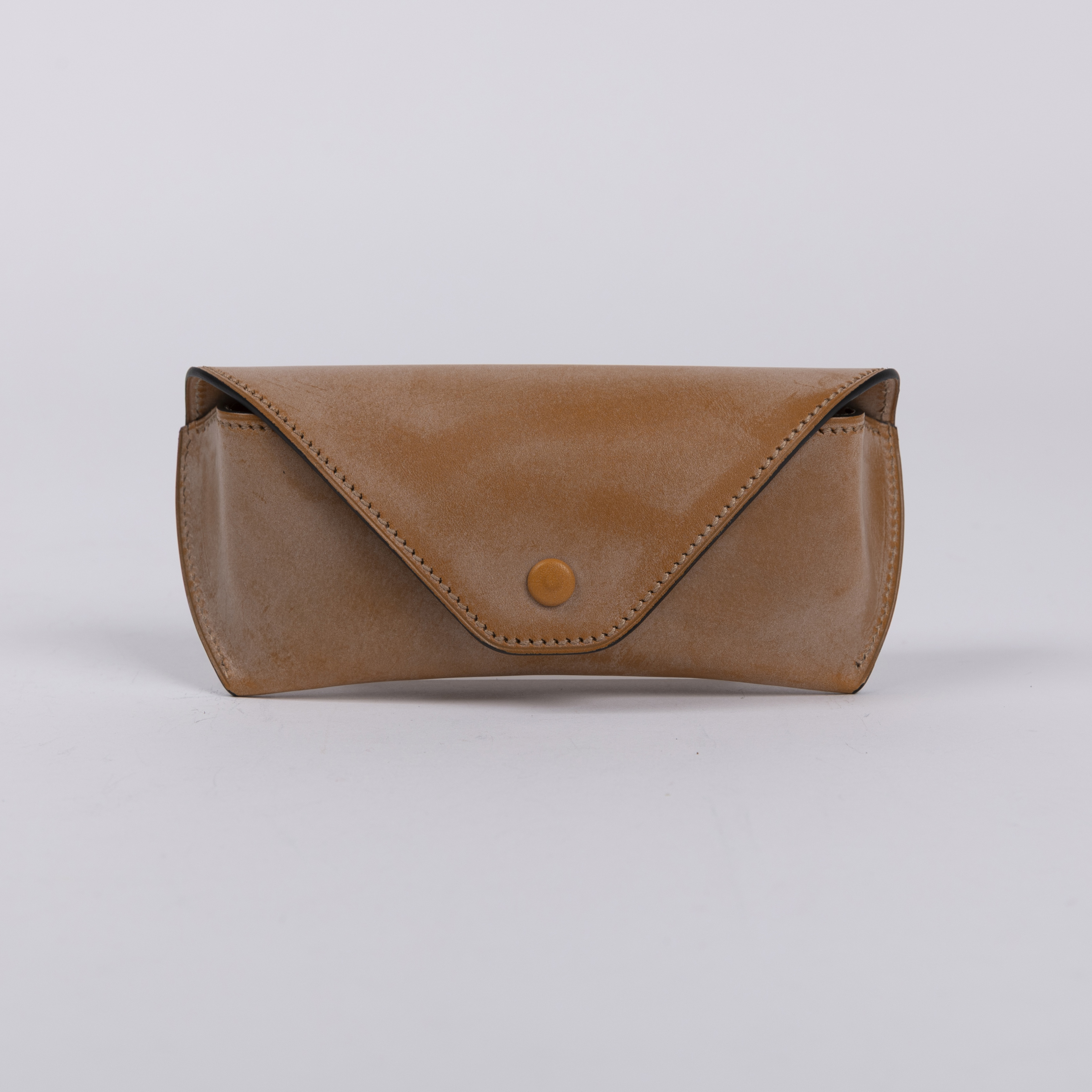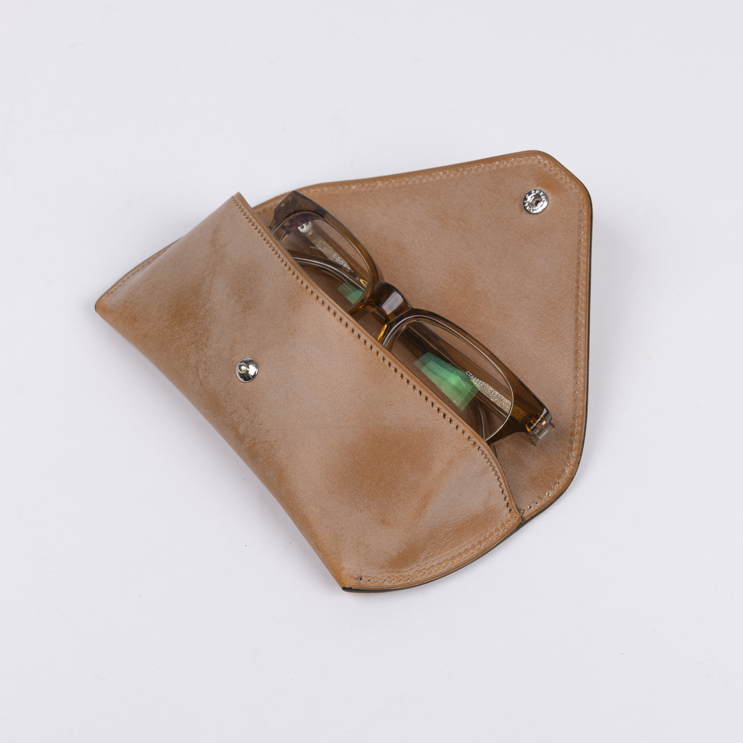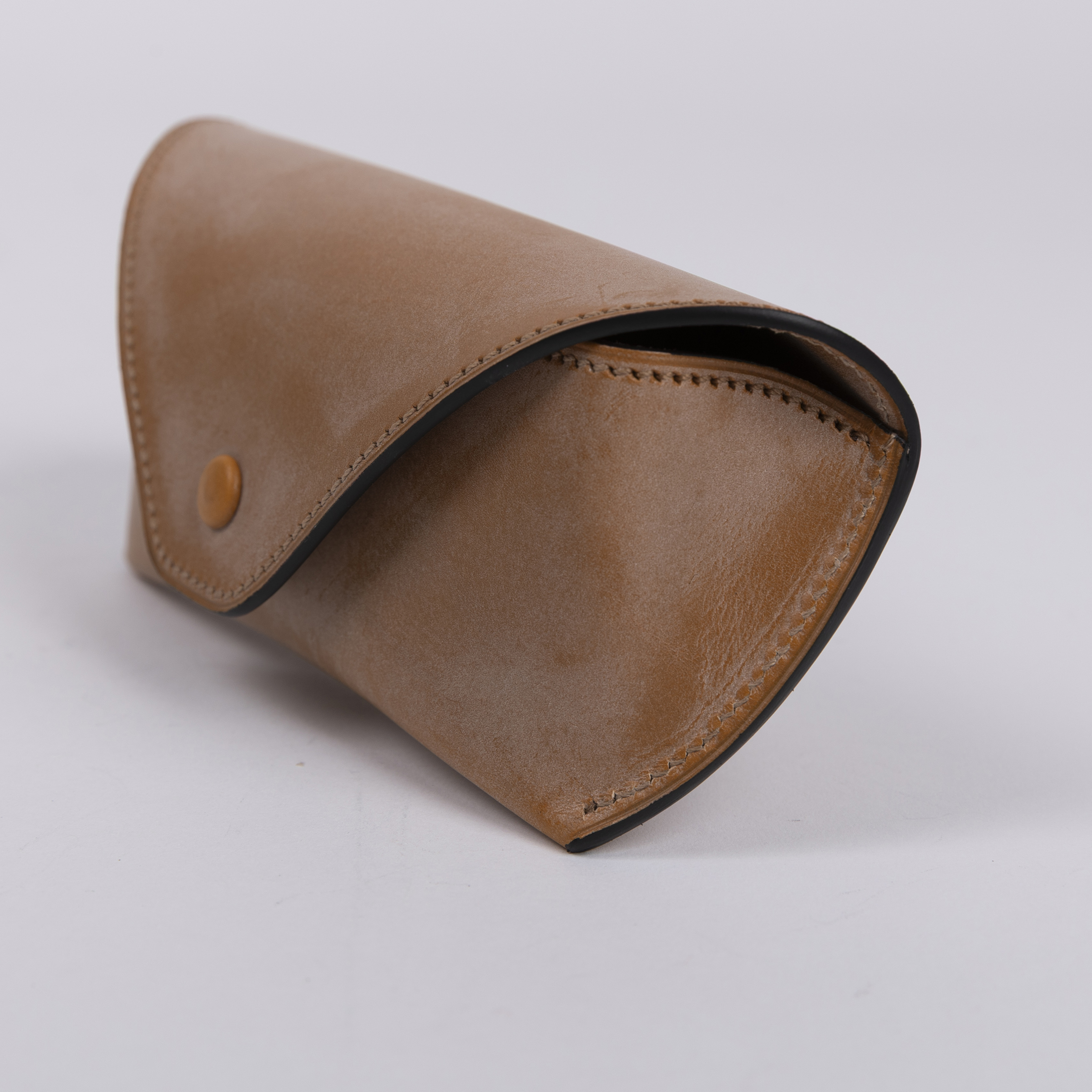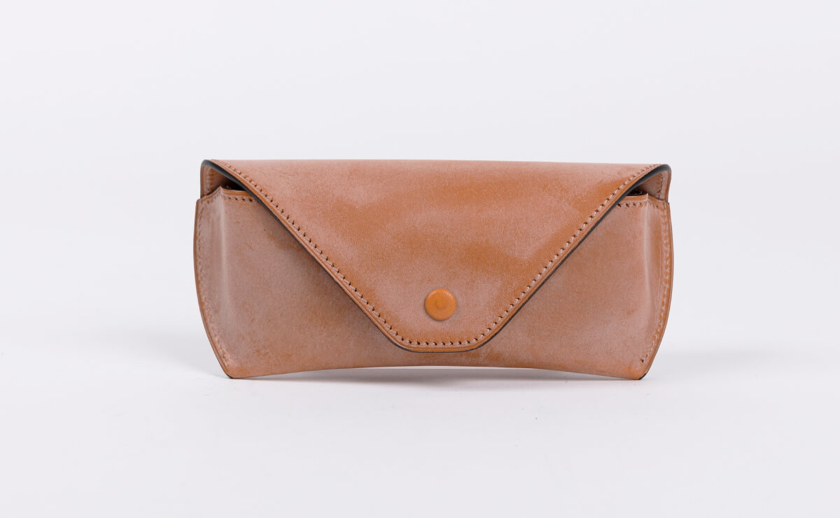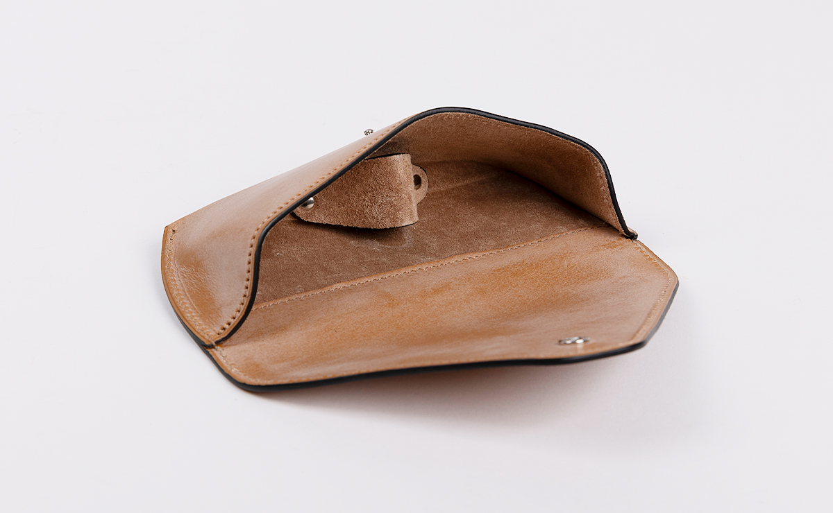 しかし、何度もサンプルを作成することで適正な革の厚みを探り出し、さらに高度な癖付け技術の習得やミシン針の微妙な調整など、職人のたゆまぬ向上心と工夫により、さまざまな問題をひとつずつクリア。内装にもブライドルレザーを使いながら、シャープな印象のメガネケースの製品化が可能になりました。