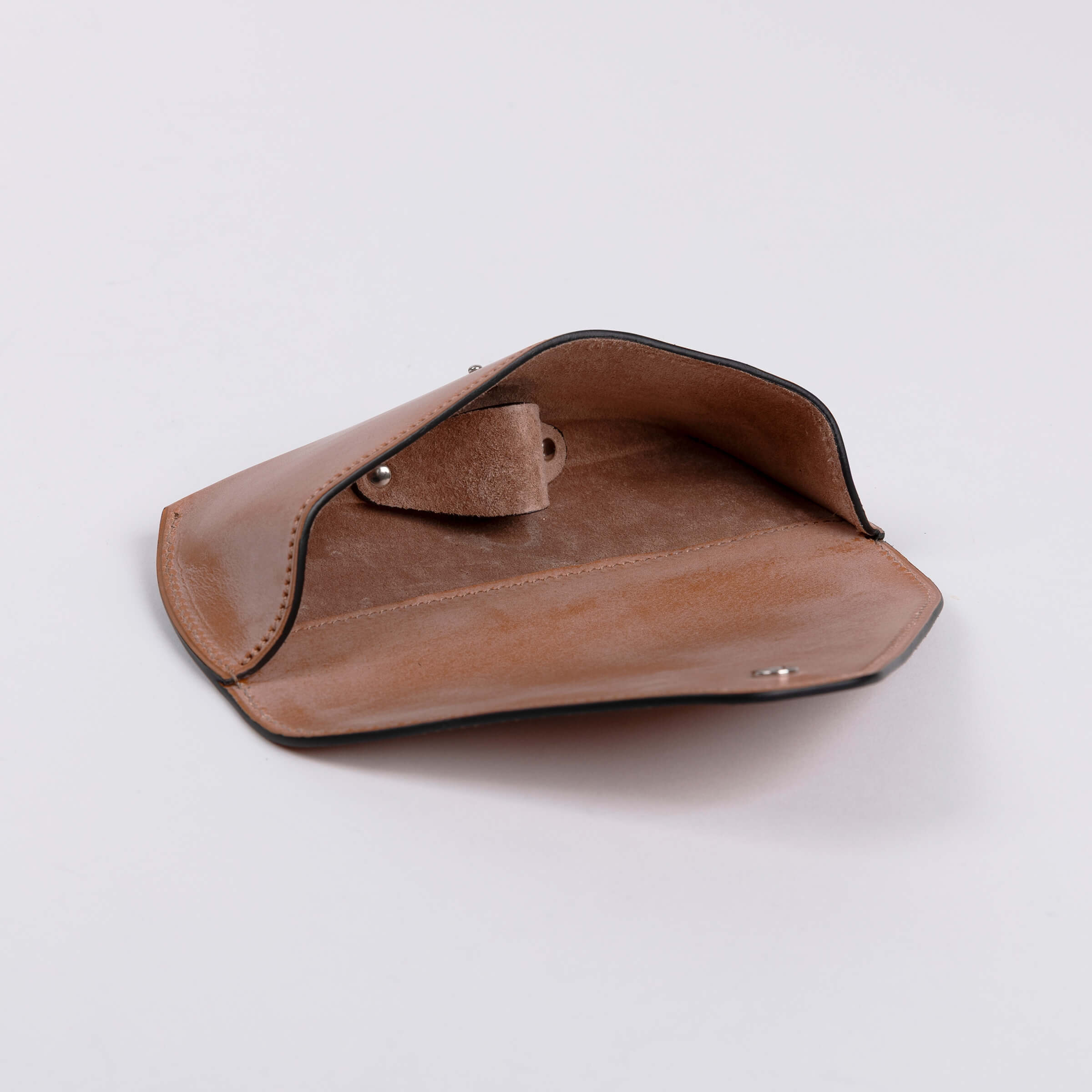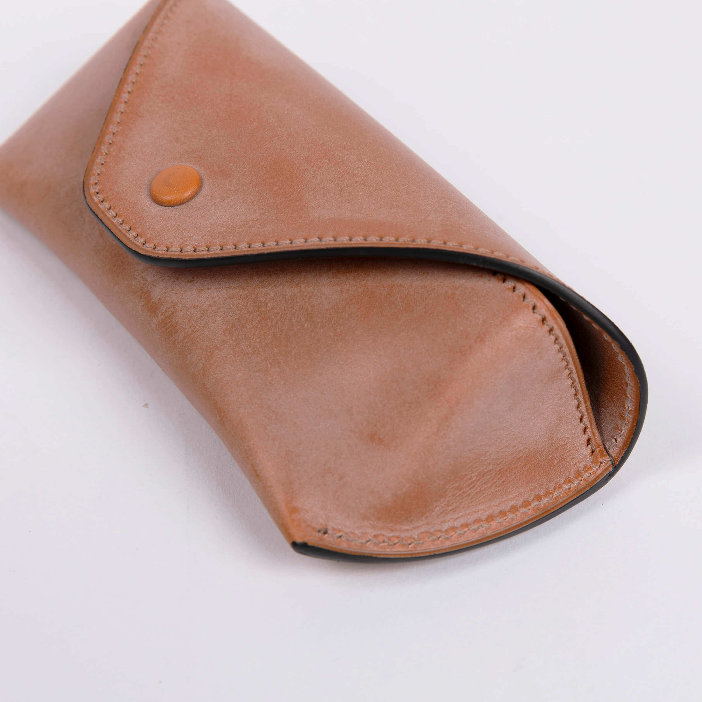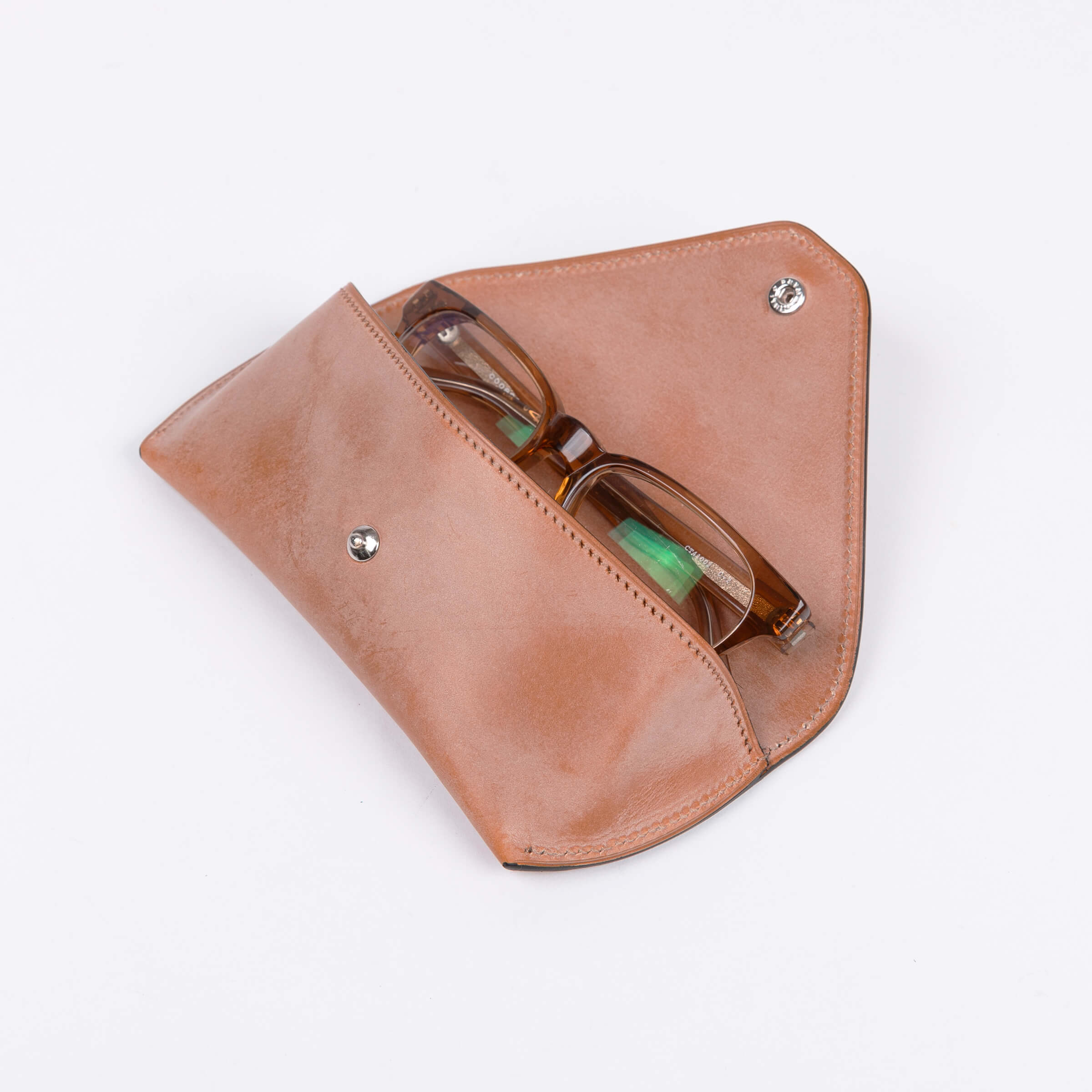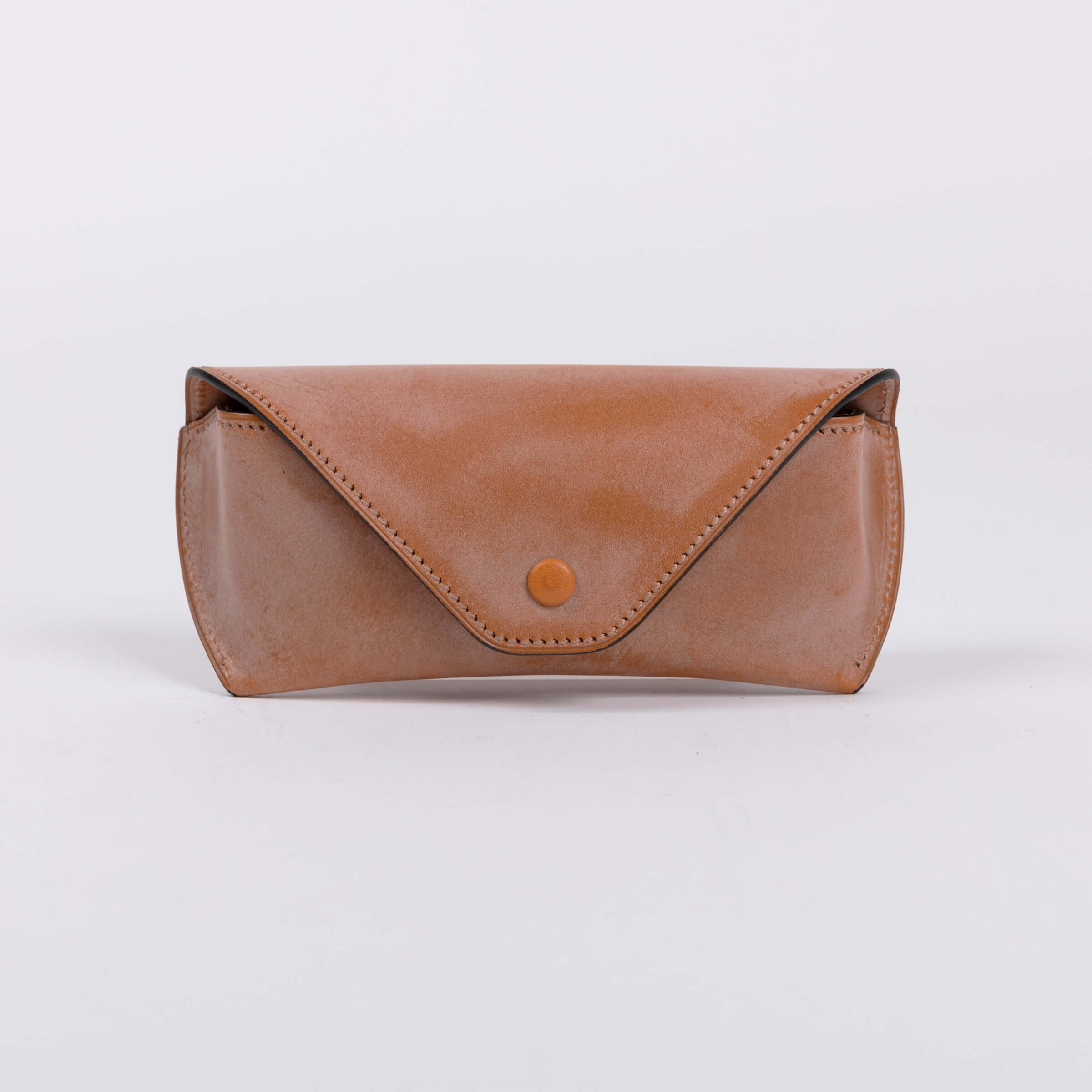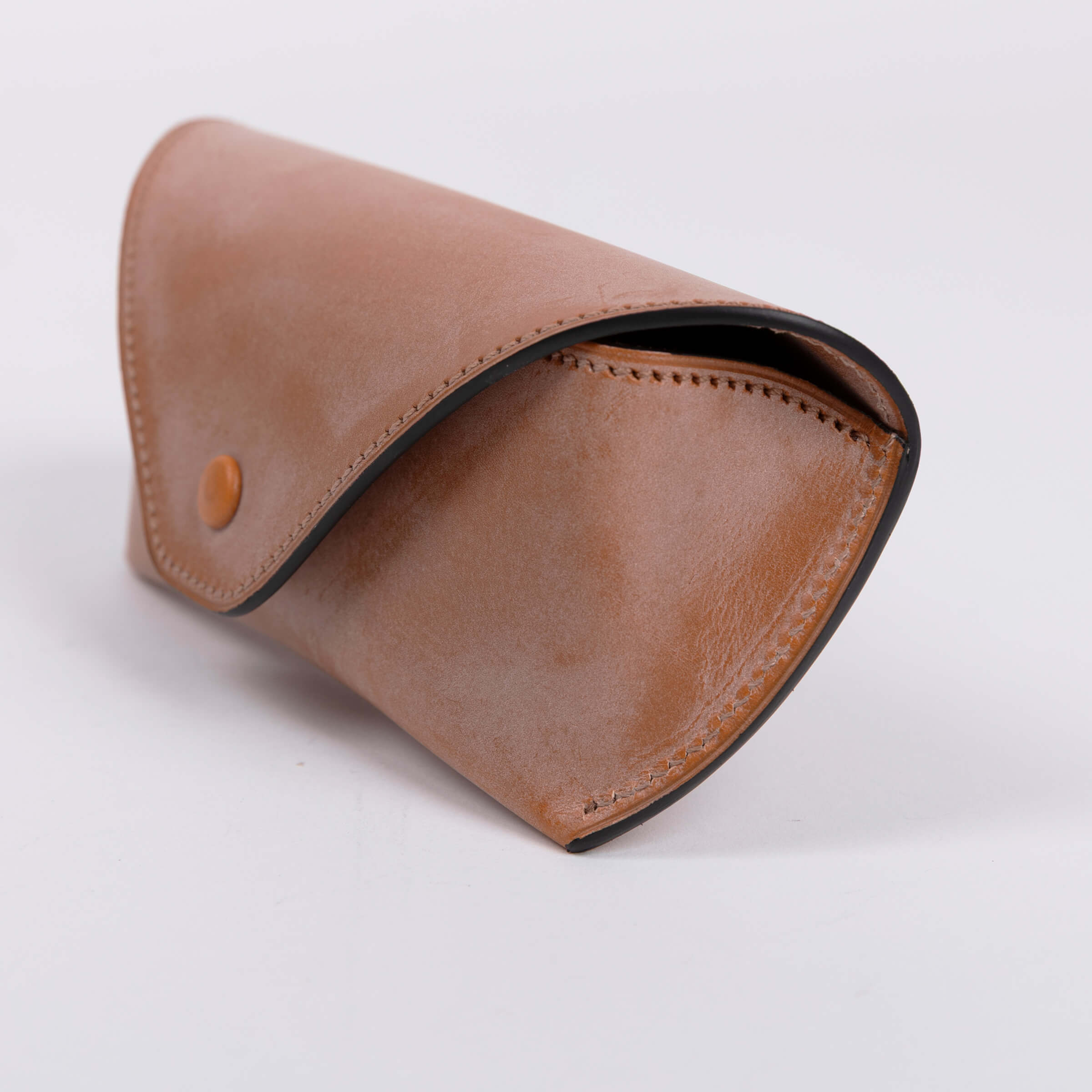 これまで社内において、メガネケースの企画化については何度も声が上がっていました。しかし、そのたびに「万双らしいメガネケースが作れるのか」と自問自答が始まり、断念してきました。 試行錯誤を繰り返し辿り着いたのが、「全面にブライドルレザーを使用したものなら、“これぞ万双”とお客様から言っていただけるようなメガネケースに仕上がるのではないか」という結論。そして企画化に踏み切り、やっと実現したのがこちらの商品になります。 実際にご覧になっていただくとわかりますが、胴面は一枚革によるダイナミックな仕上がりになっています。板のように硬いブライドルレザーを使いながら、きれいなカーブや、立体的な加工を施すことができたのは、職人の高度な技術の賜物です。 内部にはノースブリッジを装備、また内張りにピッグスエードを使用することで、お客様の大切なメガネをきちんとお守りできるよう仕上げています。