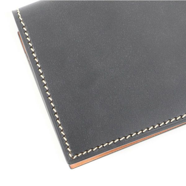 手間ひまをかけて丁寧にコバ処理がされている製品は、コバが傷ついてしまっても何度でも磨き直しが可能なため、何十年と使用された製品も、コバ磨きをすることで再び輝きを取り戻し、長くお使いいただくことができます。 こちらの名刺入れのように分厚いブライドルレザーとヌメ革を重ね、ズレないよう貼り合わせてコバを磨き上げるのは、非常に手間のかかる作業を必要とします。