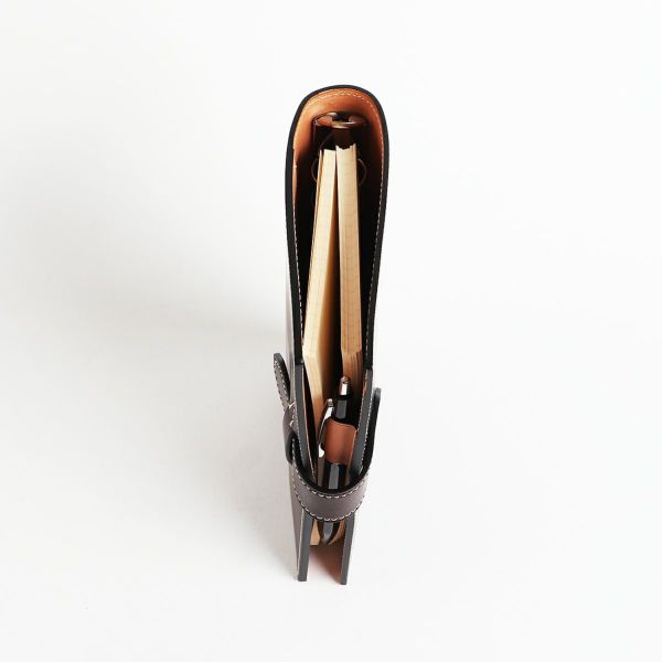 一般的な手帳ケースは内側の革をベタ貼りにしているため、表側の革のしなり具合に影響を及ぼし、背部分の形状がどうしても角張りがちです。 そこで万双では、ブリーフケースの被せ部分の製作方法と同様に、内側のヌメ革をベタ貼りにせず表側の革との間にゆとりをもせたせることで、背部分のラウンドをキレイに描くことに成功しています。