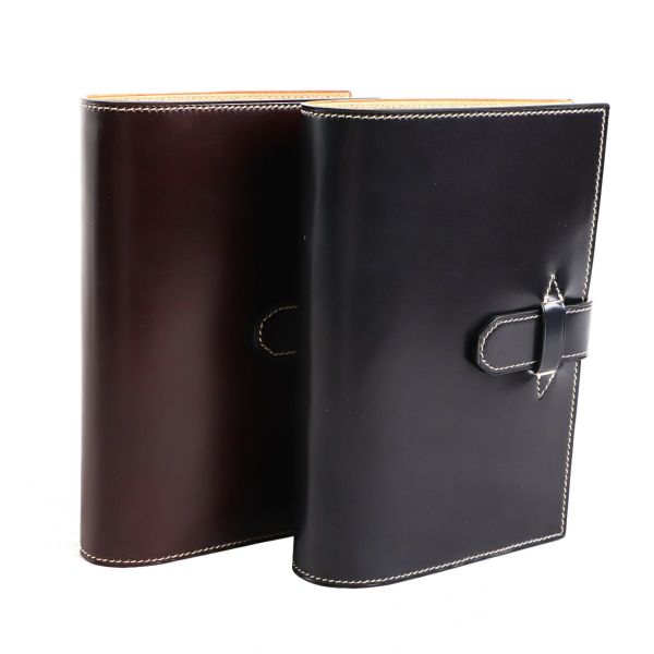 一般的な手帳ケースは内側の革をベタ貼りにしているため、表側の革のしなり具合に影響を及ぼし、背部分の形状がどうしても角張りがちです。 そこで万双では、ブリーフケースの被せ部分の製作方法と同様に、内側のヌメ革をベタ貼りにせず表側の革との間にゆとりをもせたせることで、背部分のラウンドをキレイに描くことに成功しています。