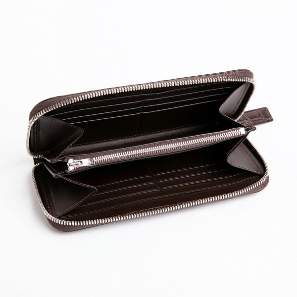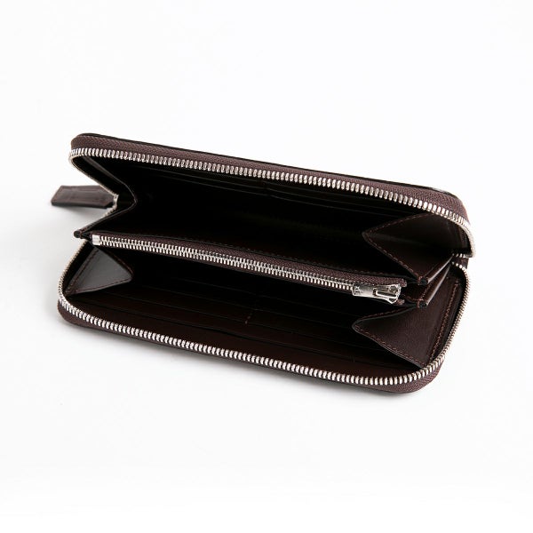 ラウンド長財布の最大の魅力はその収納力。こちらは、ファスナーを開けると両側に札入れとカードフォルダー12ヶ所、エアチケットなどが収納可能なポケットを2ヶ所を装備。ポーチやミニクラッチバッグ代わりとして、使われるお客様も多い財布となっています。