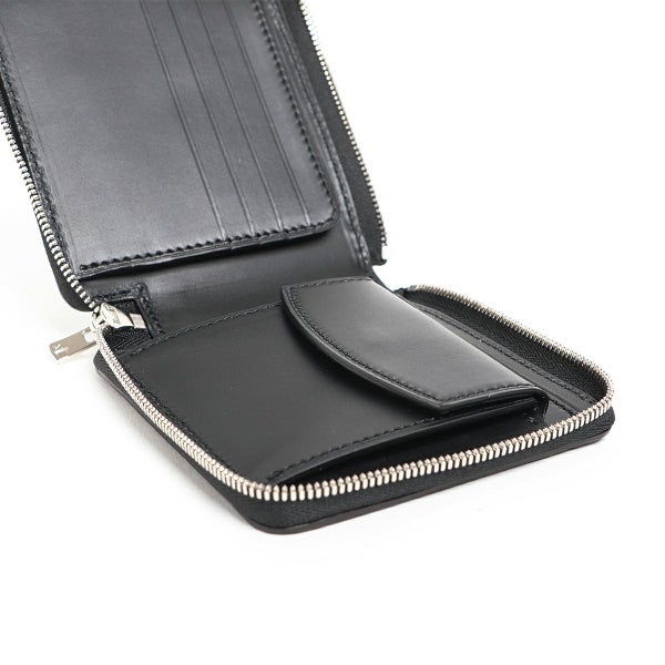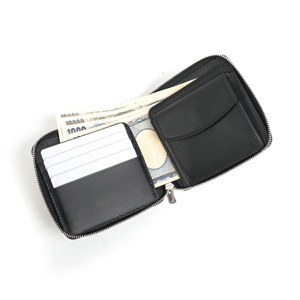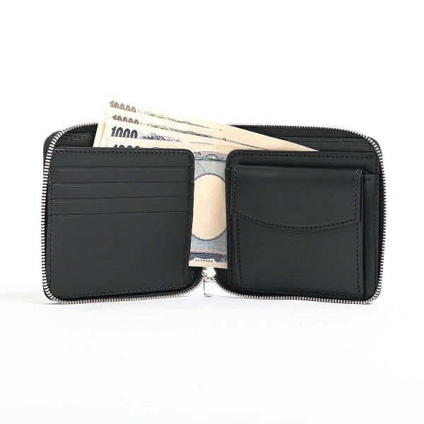 ポケットに入るラウンド財布”をコンセプトに、利便性と造形美を両立させるファスナー付き二つ折財布。 二つ折りのサイズの魅力や収納力を残しながら強度を上げているので、通常の二つ折り財布以上にガシガシとお使いいただけます。