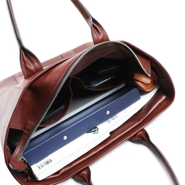 古くからあるサンタフェトートバッグを、ビジネスシーンでも使いやすいよう天ファスナー付きに改良、さらに革素材をシモーネBOXへと変更しました。 バッグ底面から伸び持ち手になっているベルトは、バッグの耐久性を向上させるとともに持ち心地も向上。 肩がけした際のフィット感にも気をくばり、持ち手は芯材を挟んで織り込んで作っています。 さらにバッグ全体の型崩れを防ぐために、底部に一風変わったマチをつけています。 底鋲以外に金具を使わず、内装生地をナイロンを採用しているため、万双のバッグの中で最軽量クラスとなっており、客様から高い評価をいただいております。