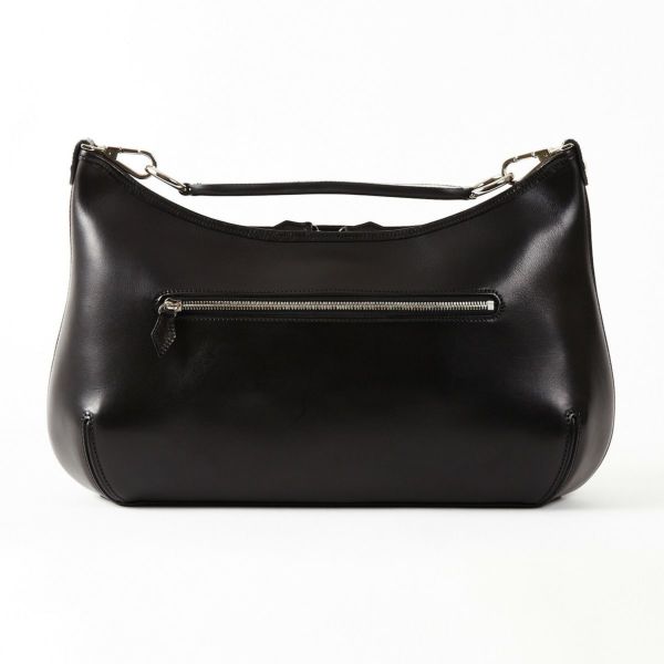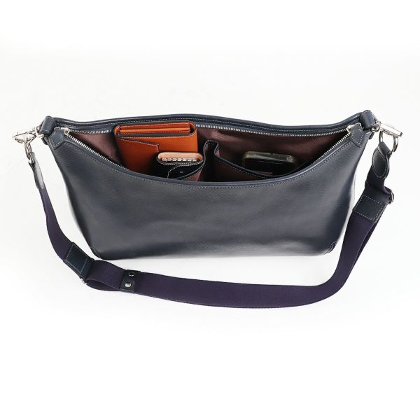 ビスポーク靴のヒールを思わせる、立体的で優美な形状が特徴のショルダーバッグ。 ユニセックスなデザインのため、女性のお客様から好評をいただいています。 見た目以上に容量があり、また持ち手とストラップ両方をつけられる2WAY仕様となっていますので、様々なシーンでご利用いただけます。 また持ち手は革3枚を貼り合わせおり、ダレスバッグのコバ並みに厚く仕上げているので、すこぶる持ちやすく、強度を飛躍的に向上させています。