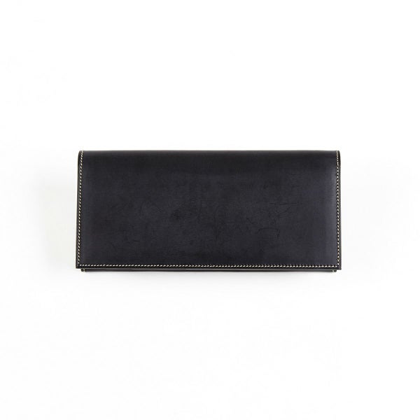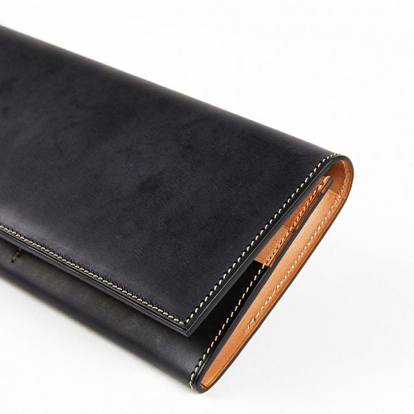 「スーツに合う、シンプルだけど高級感のある長財布」。このコンセプトを実現するために考案したのが、表側をブライドルレザーの一枚革で構成するという贅沢な仕様でした。 また内装も、蛇腹状に折込まれたマチの美しさを徹底的に追求。 一切無駄のない、洗練された長財布が完成したと自負しています。