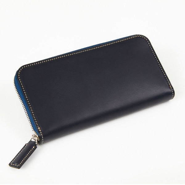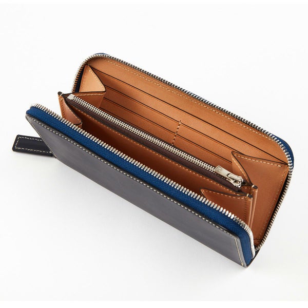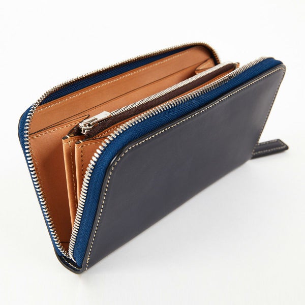 ラウンド長財布の最大の魅力はその収納力。こちらはお札も20枚以上が余裕をもって収納可能。 またカード類を14枚収納できるカードフォルダーを両側に配し、さらにエアチケットなどが収納可能なポケットも装備。 たくさん収納してもなるべく膨らまないよう設計することで、スーツスタイルにマッチするフォルムへと仕上げました。